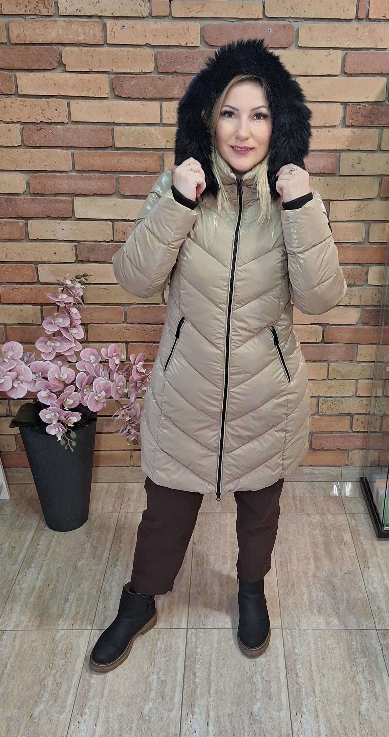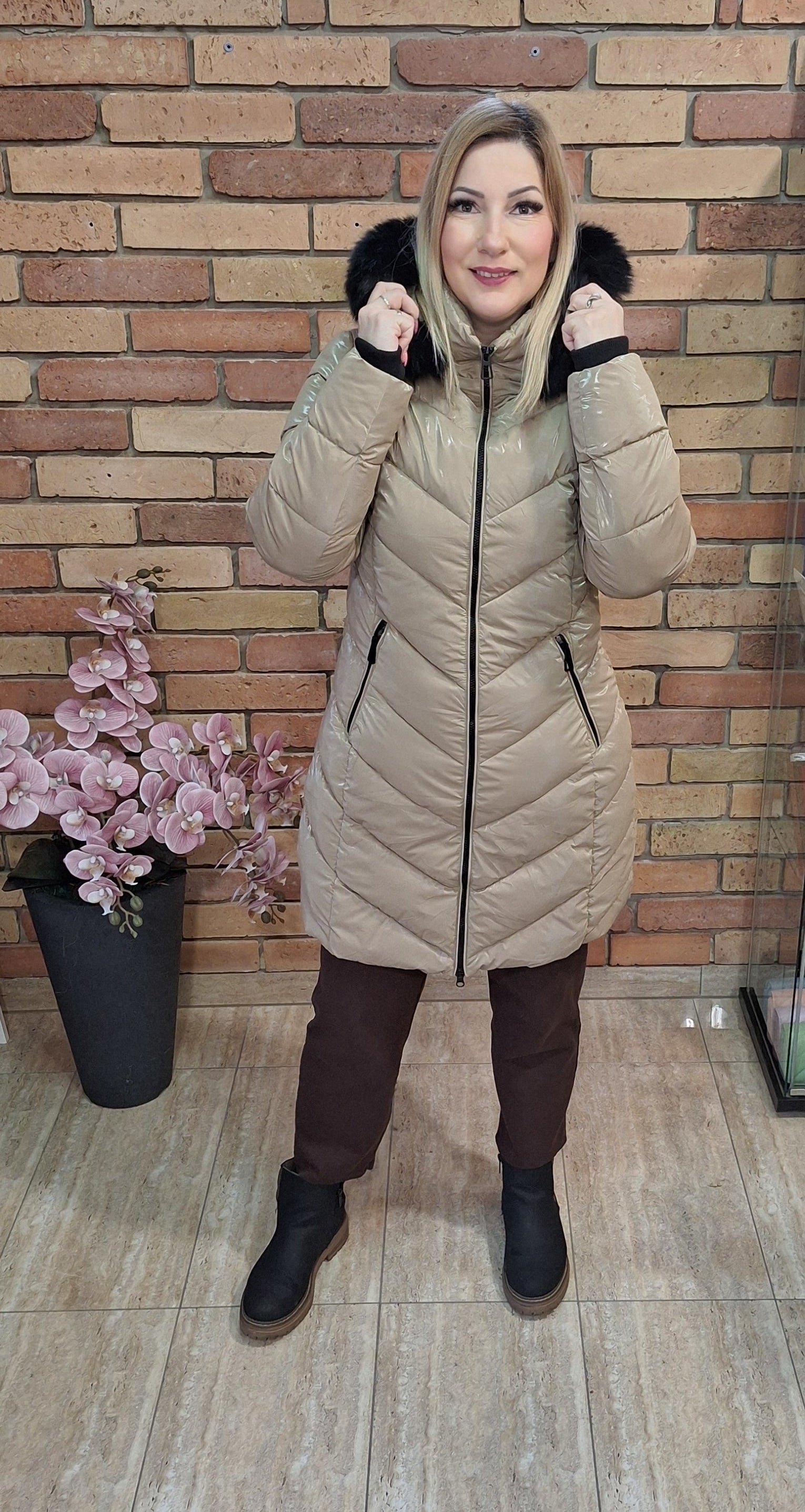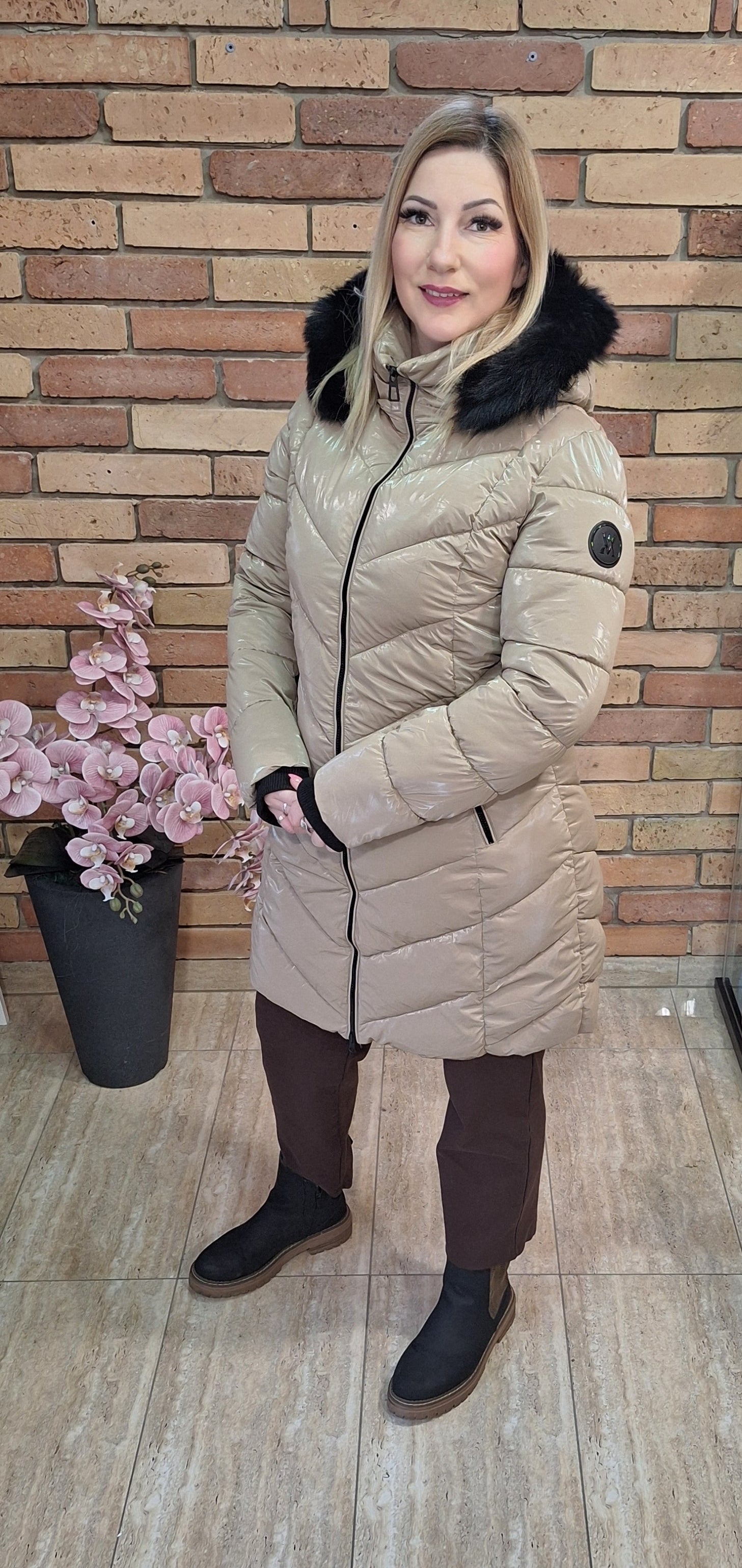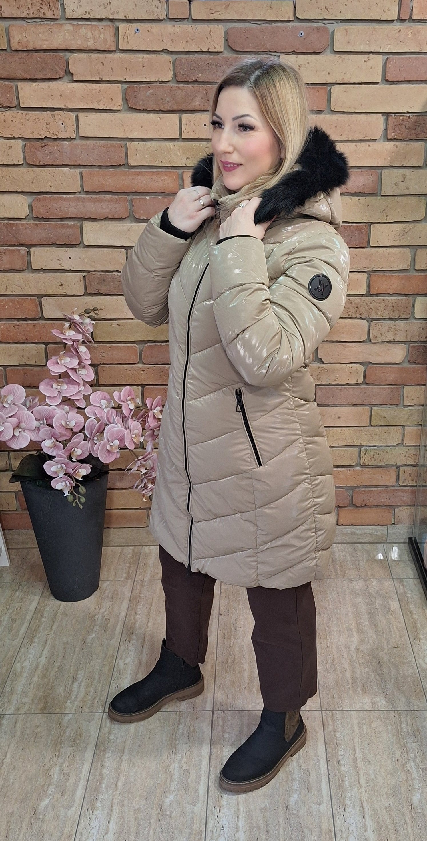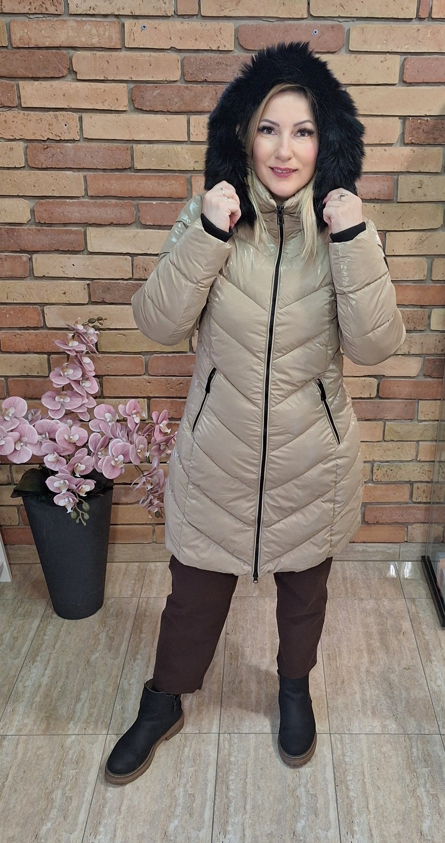 Különleges színű steppelt fényes kabát! Kapucnis ami levehető!