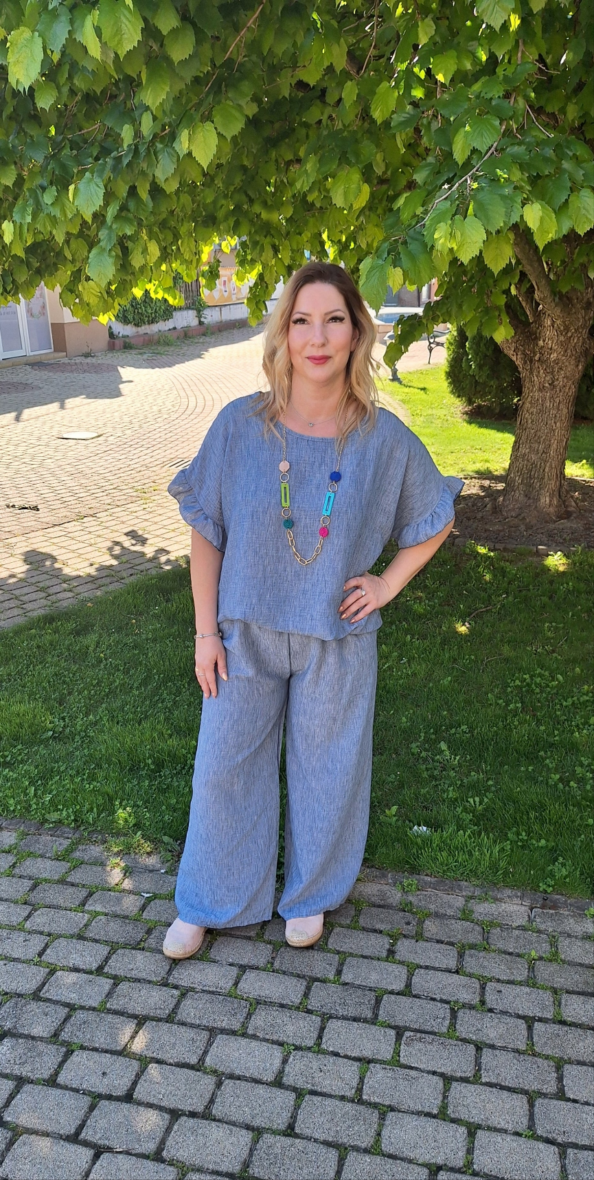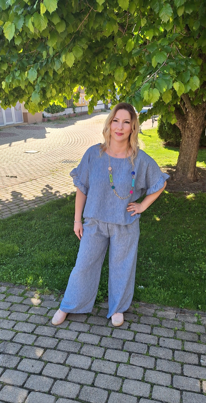 Pamutvászon együttes! Felső újjrésze fodros. Nadrág gumírozott! Egyméretes S-xl-ig! Ajándék lánccal!