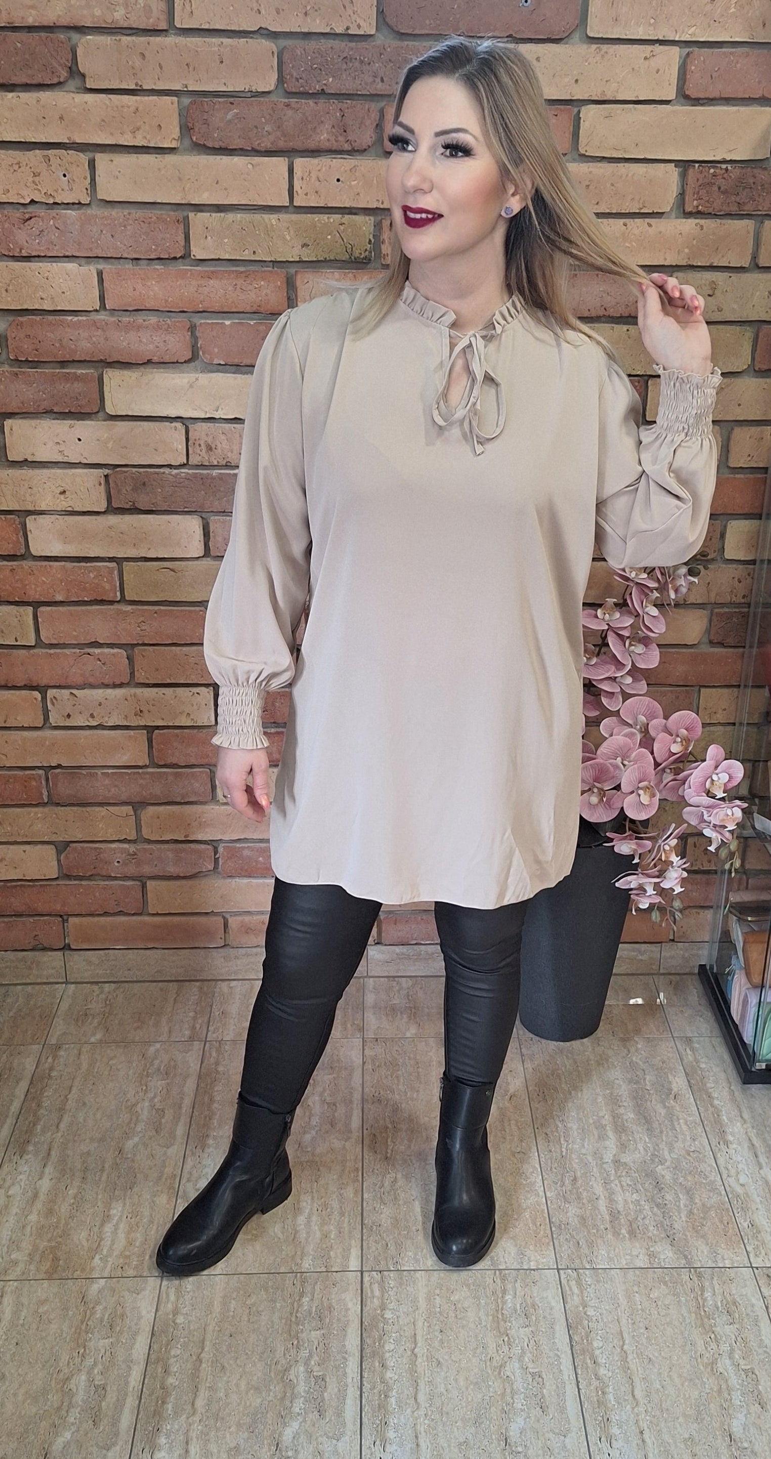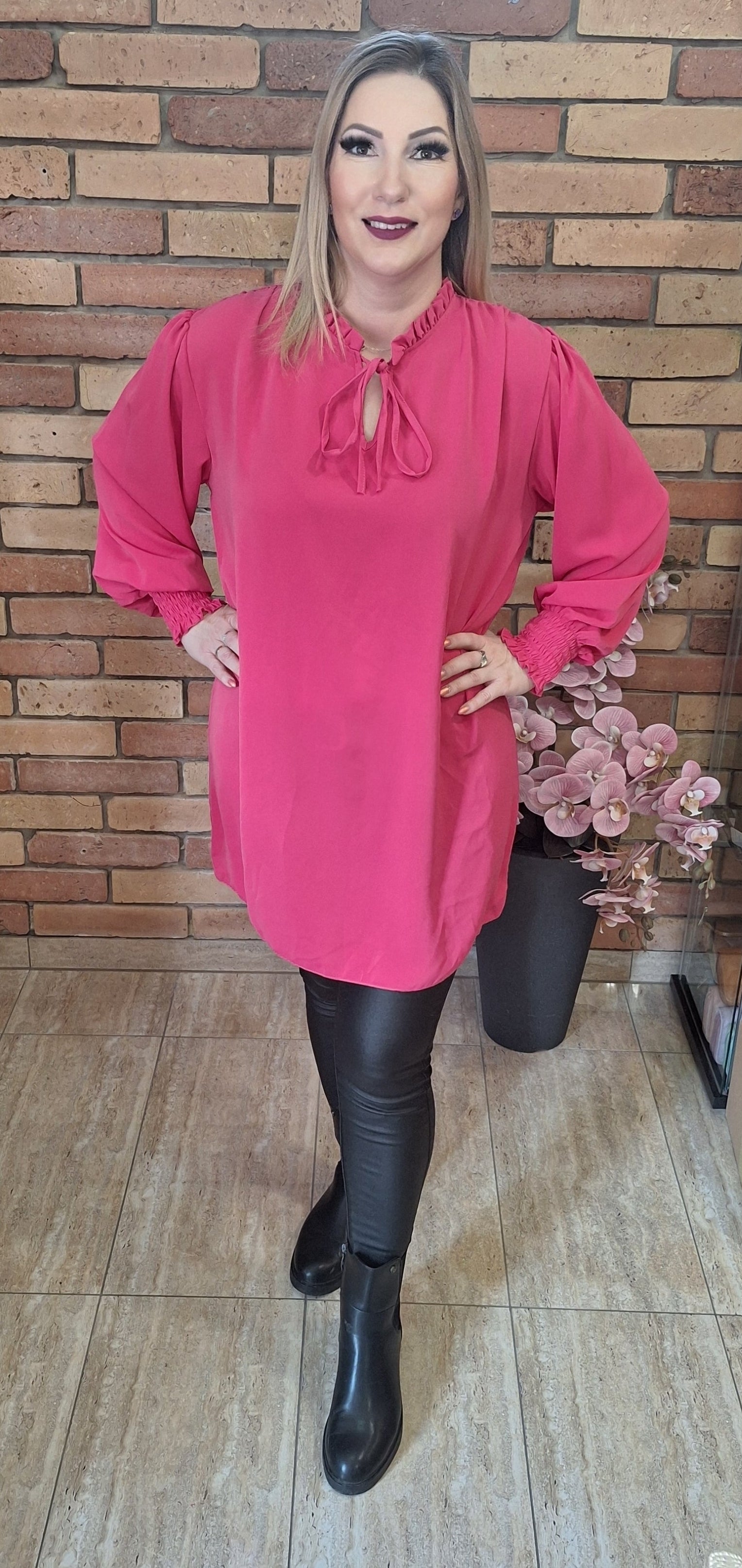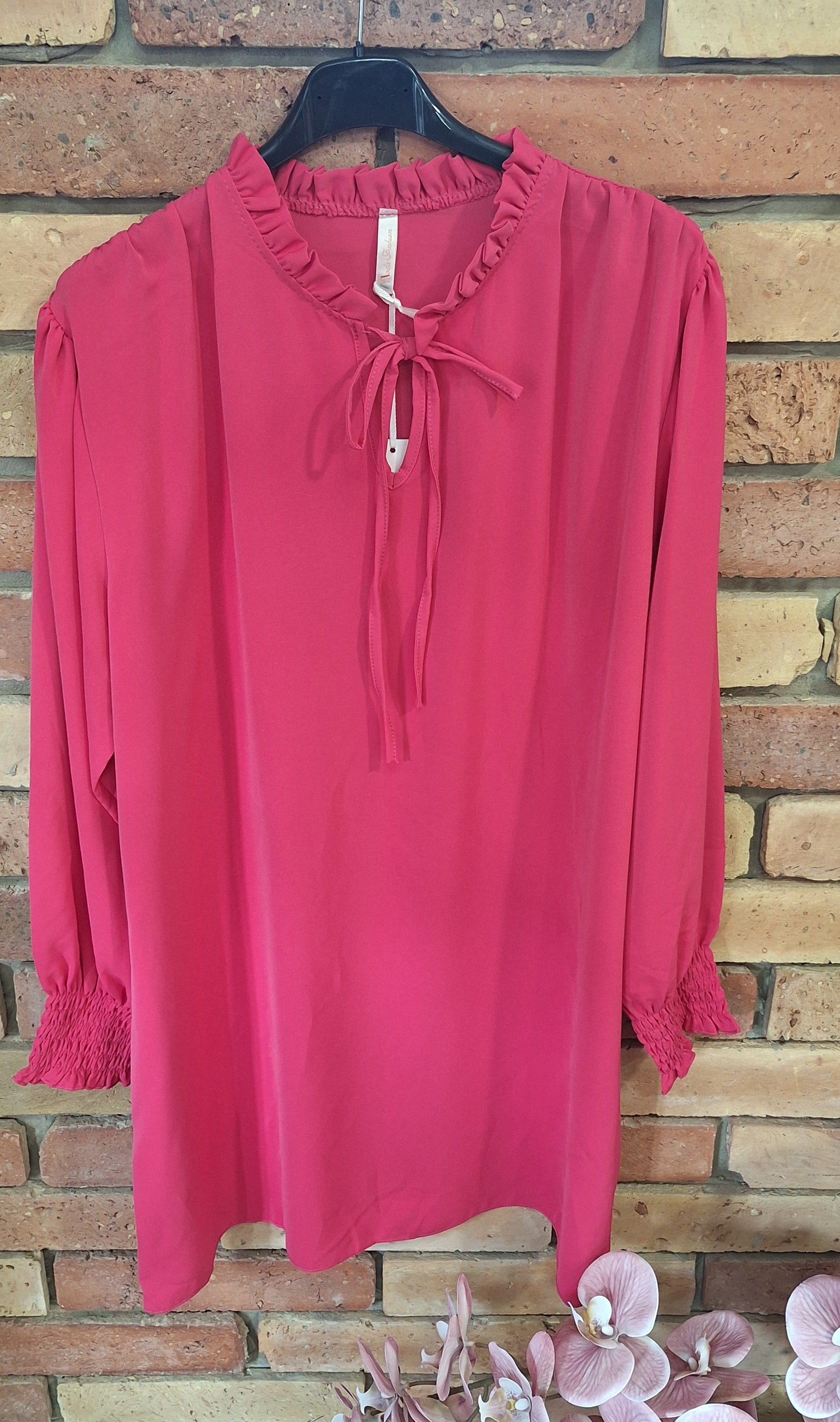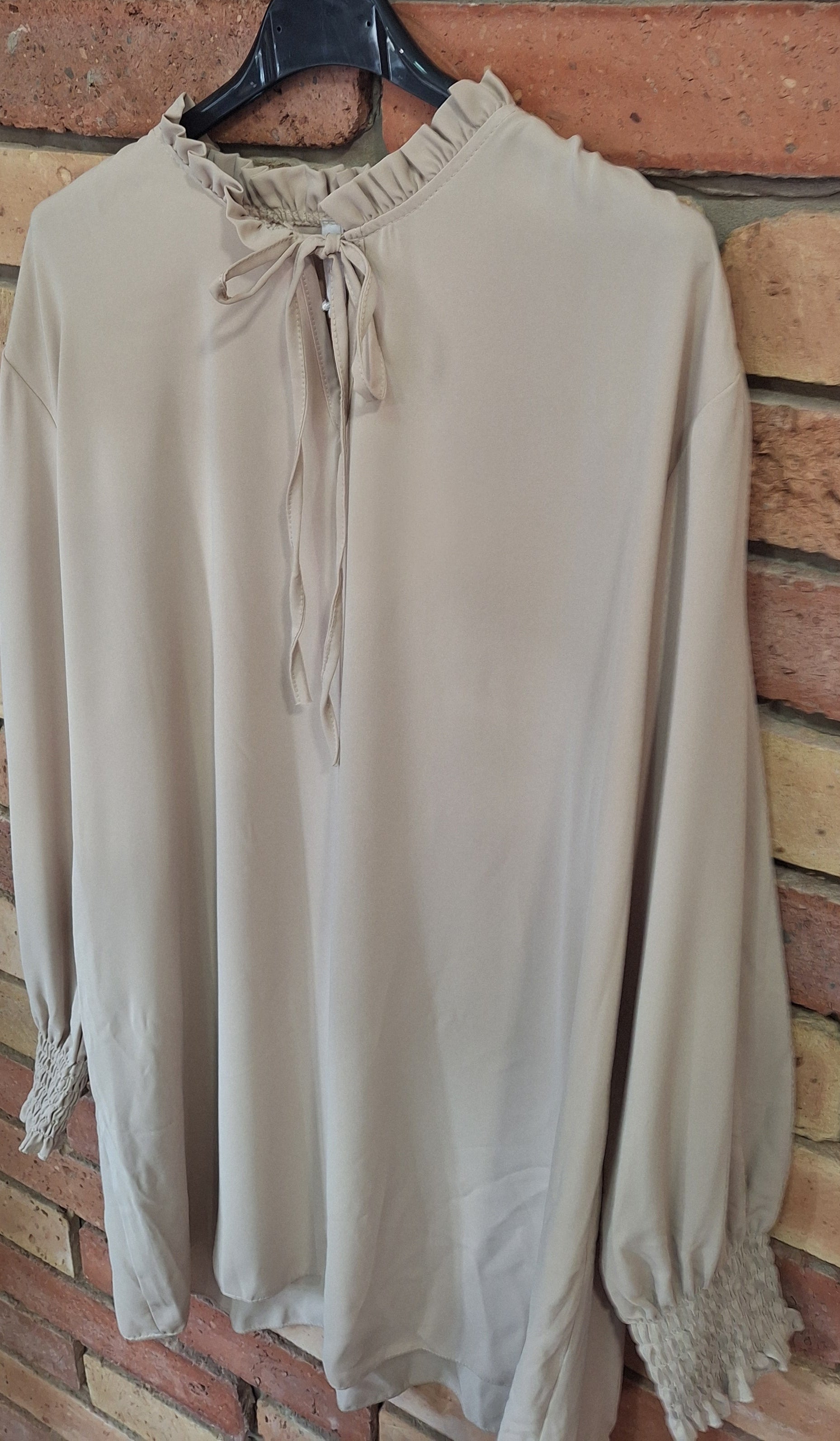 Csinos, fodros nyakú blúz. Ujja ráncolt. Hosszított, egyméretes S-kisebb Xl-ig