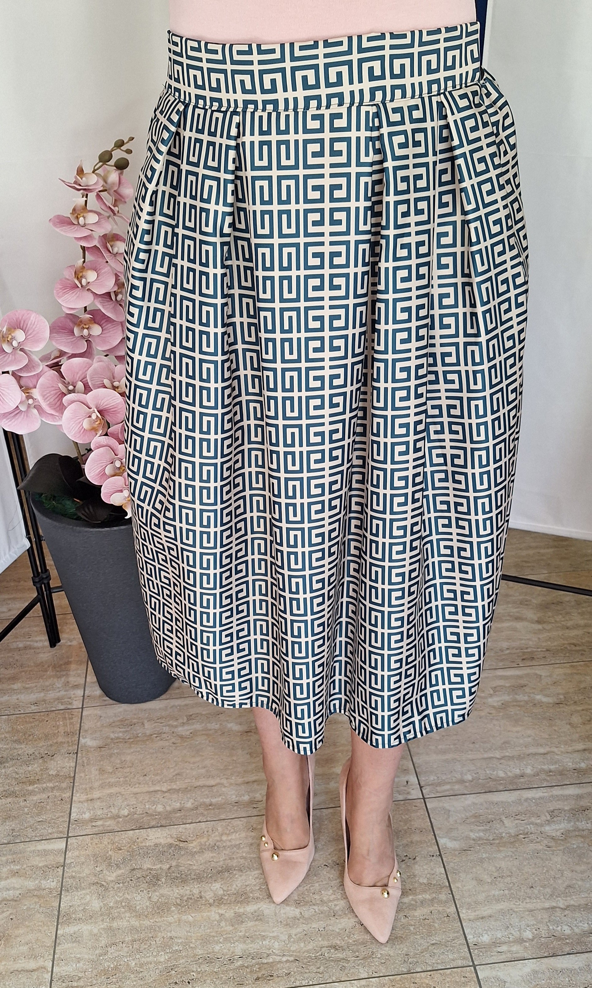 Csodaszép szoknya. Zöld mintás bézs alapon.