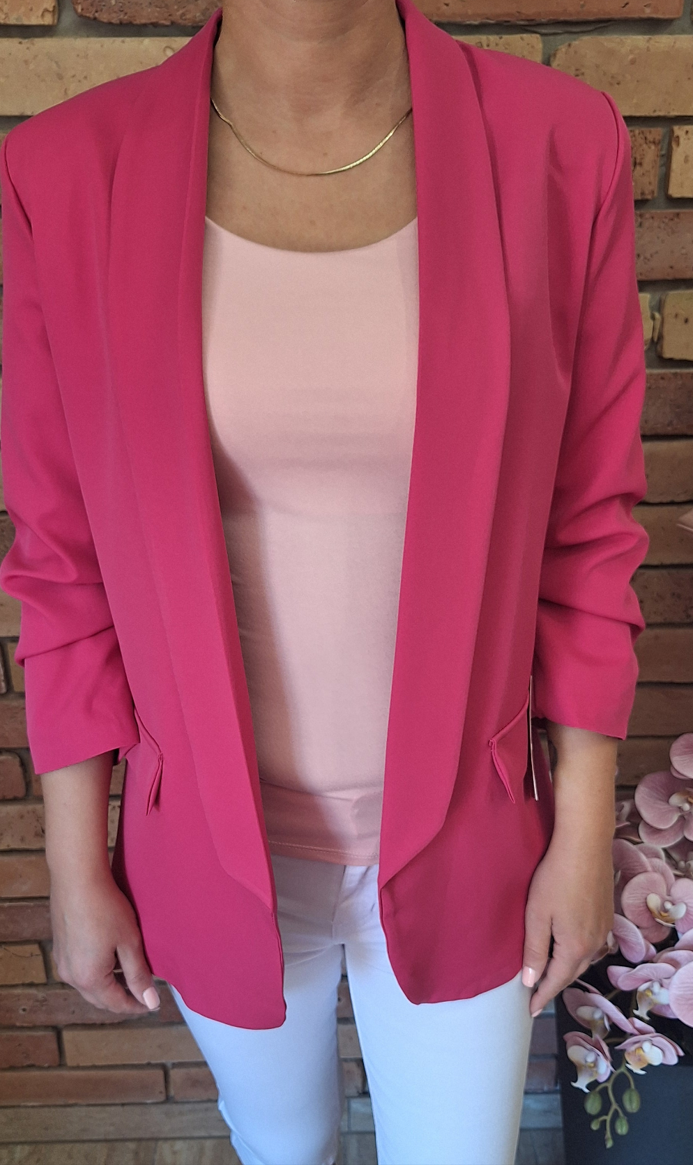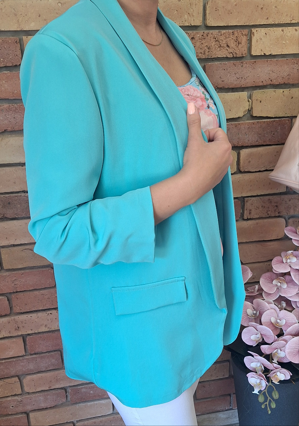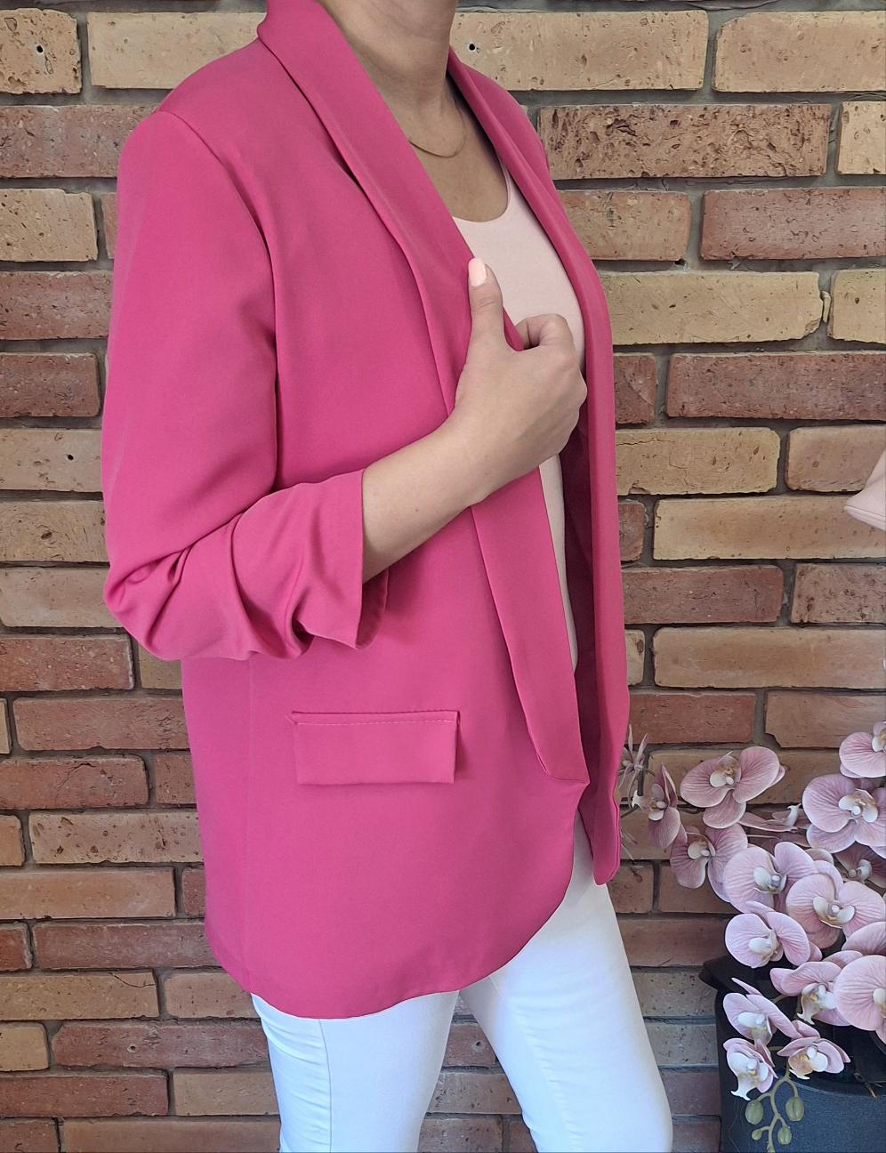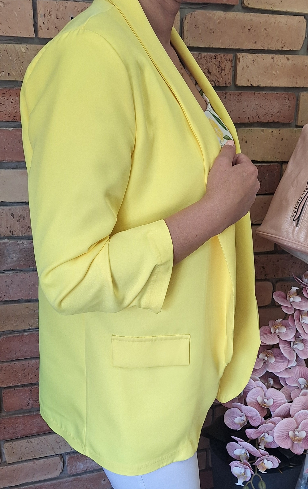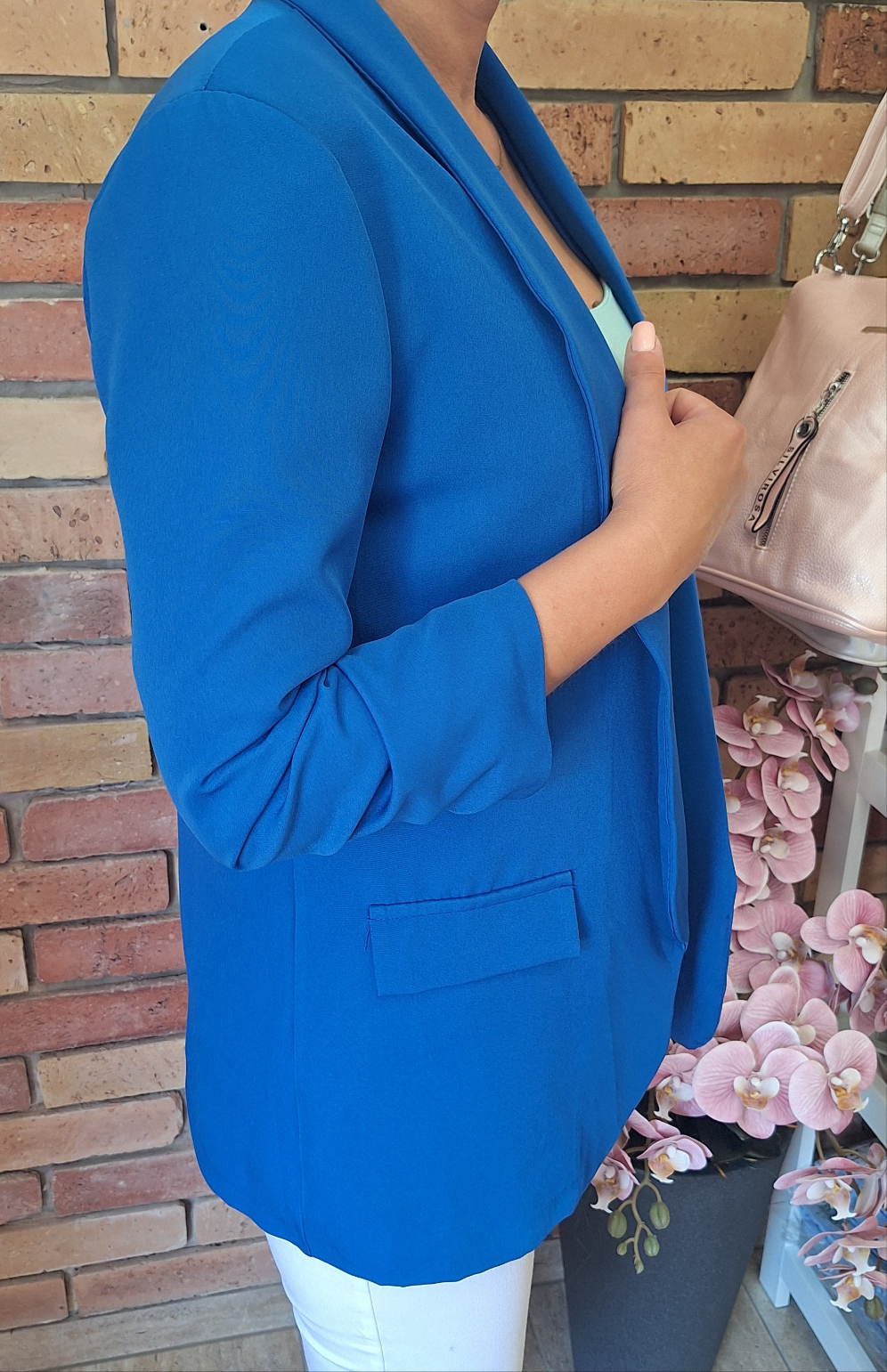 Nagyméretű, egyméretes blézer! Húzott, háromnegyedes ujjú! Gomb nélküli!