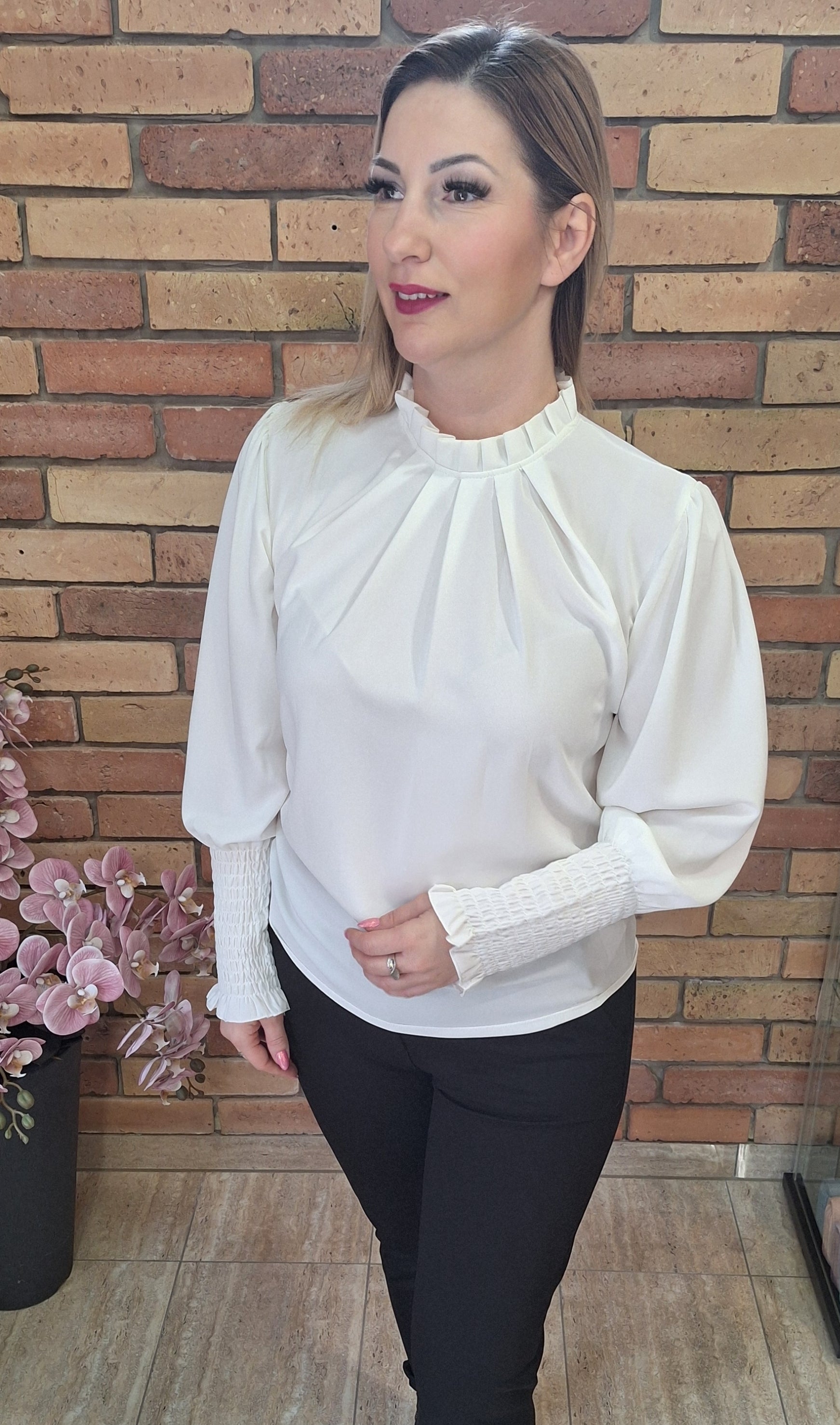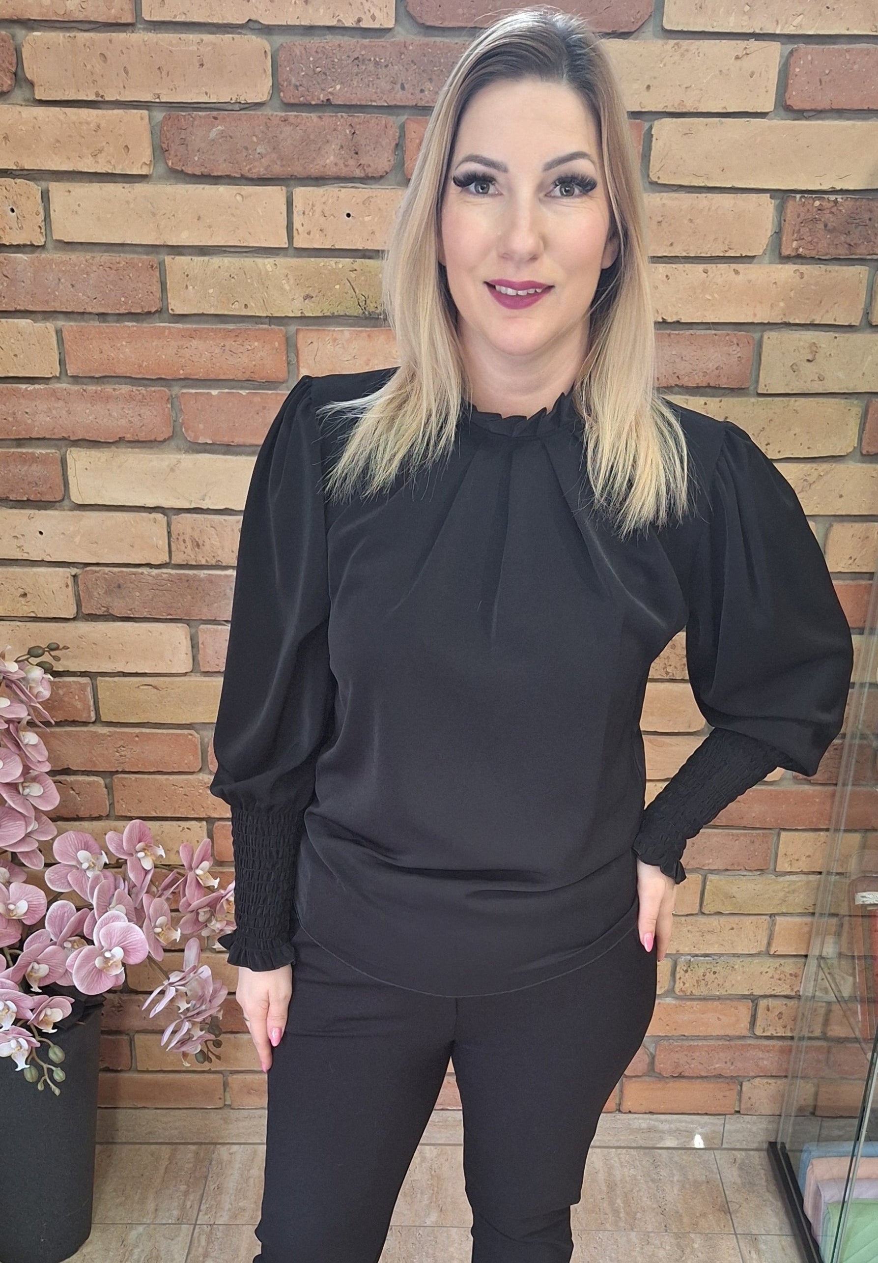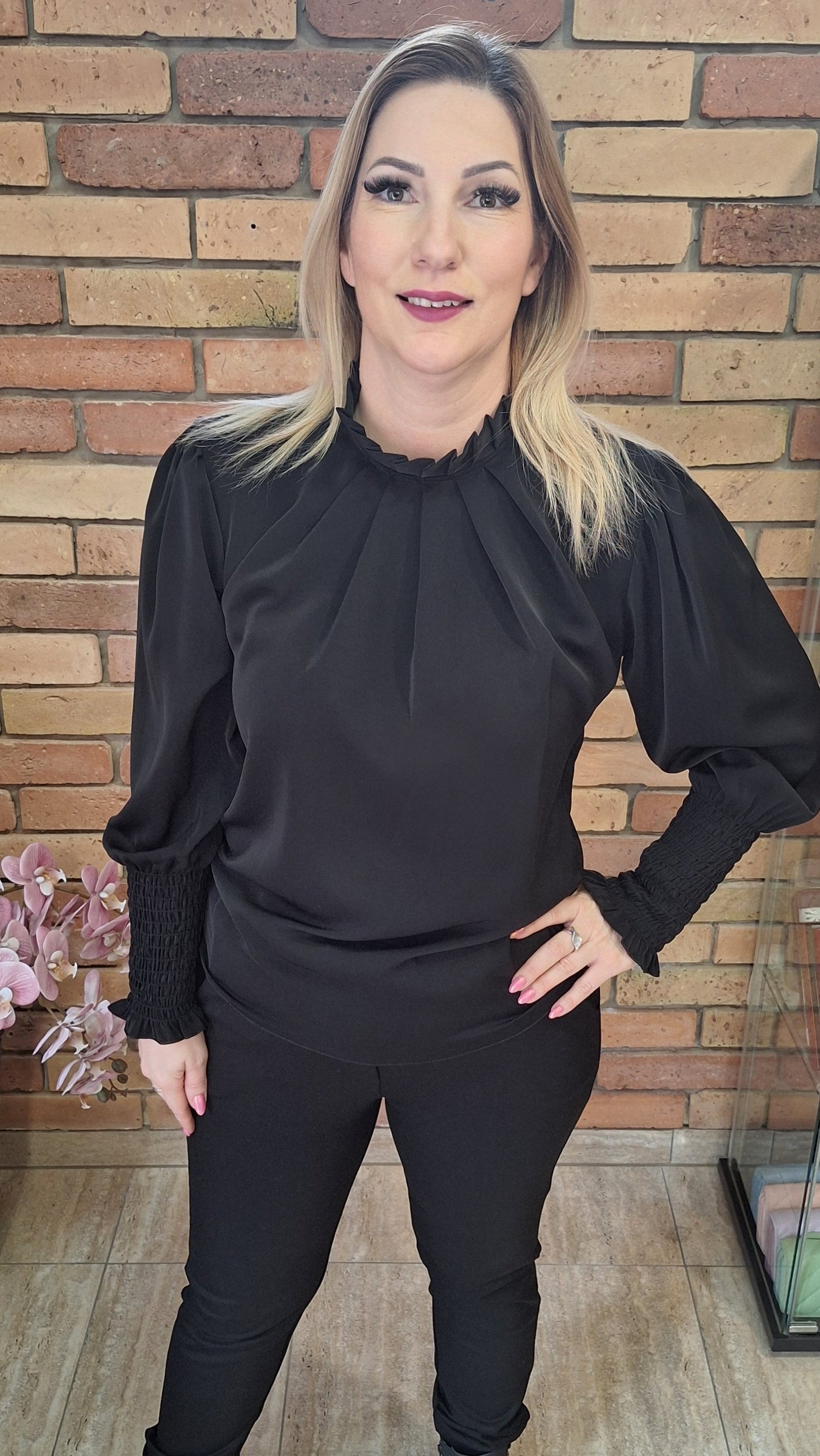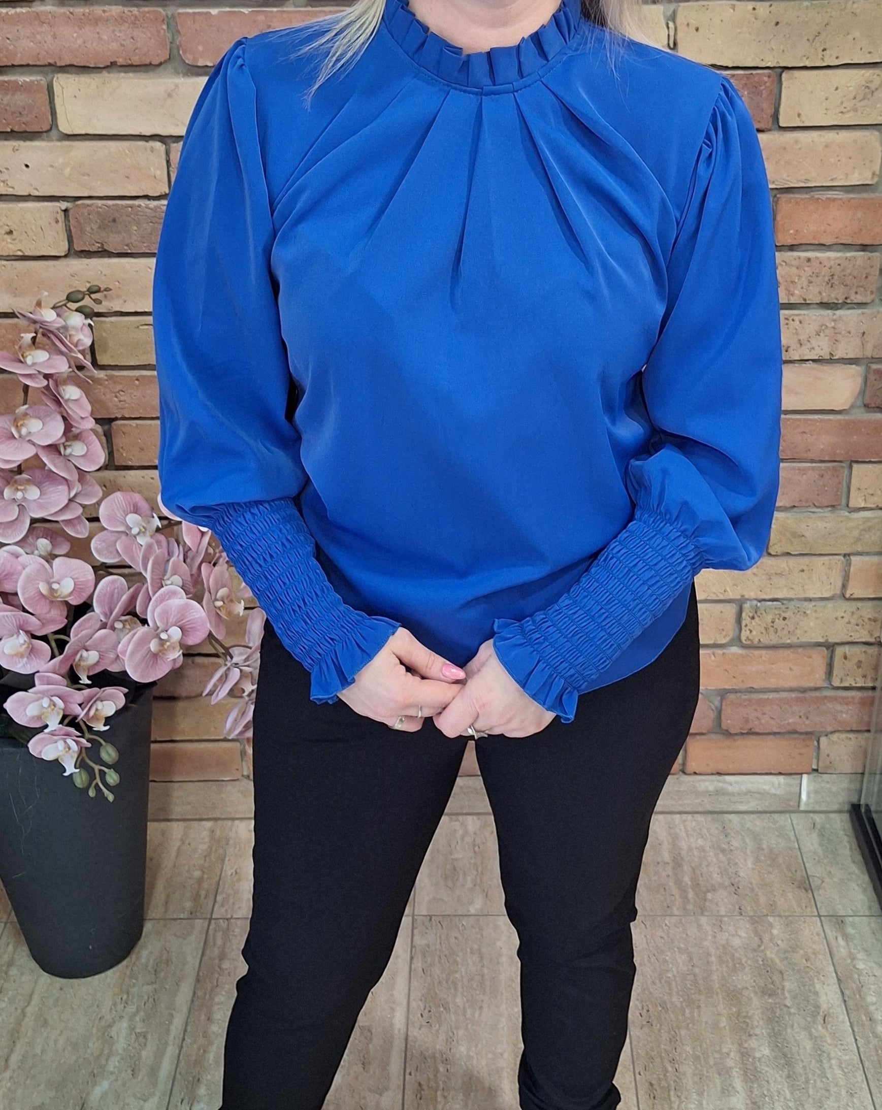 Csodaszép blúz, magasított fodros nyakkal! Mellnél húzott, ujja gumis passzés! Egyméretes S-l méretre ajánljuk!