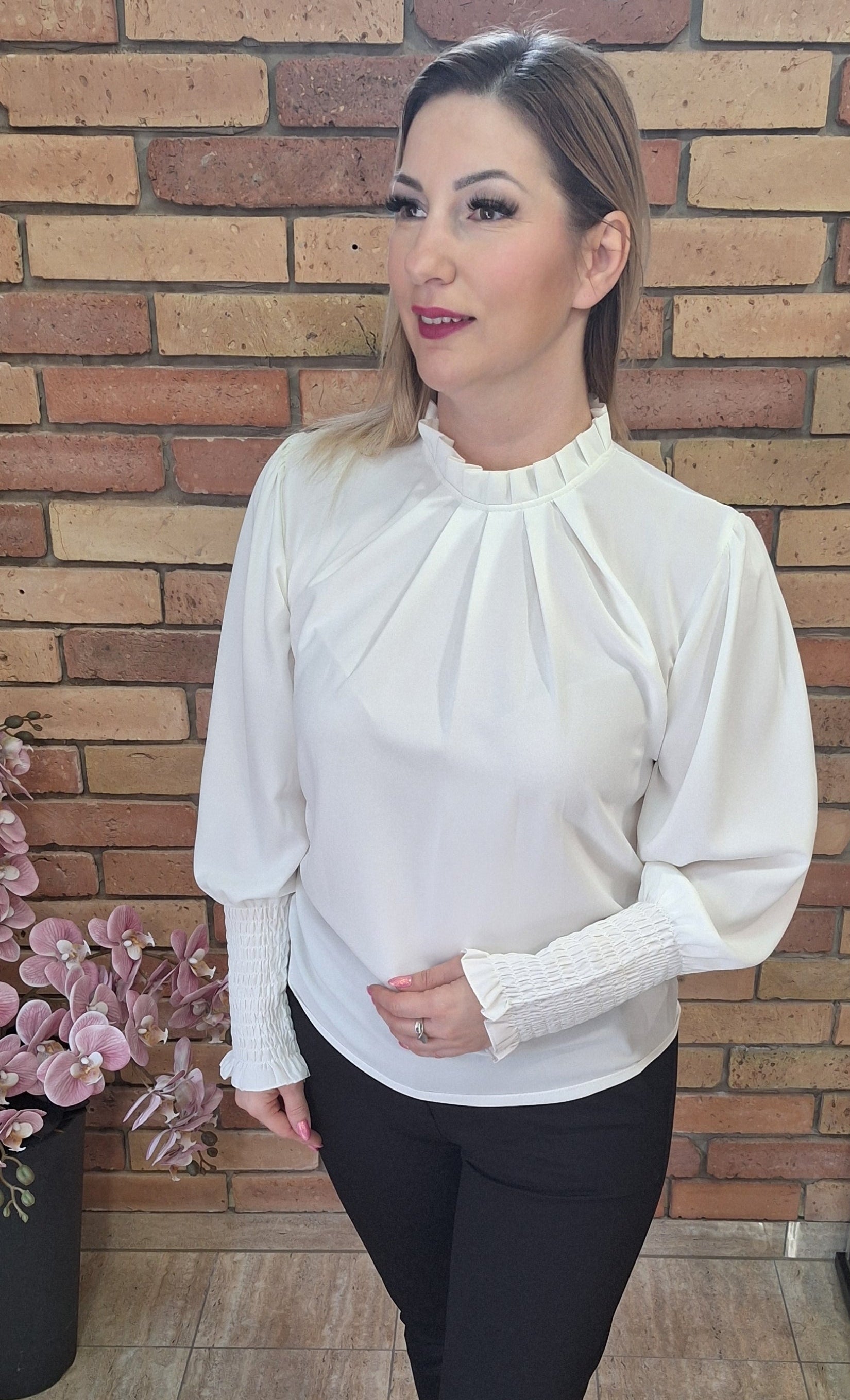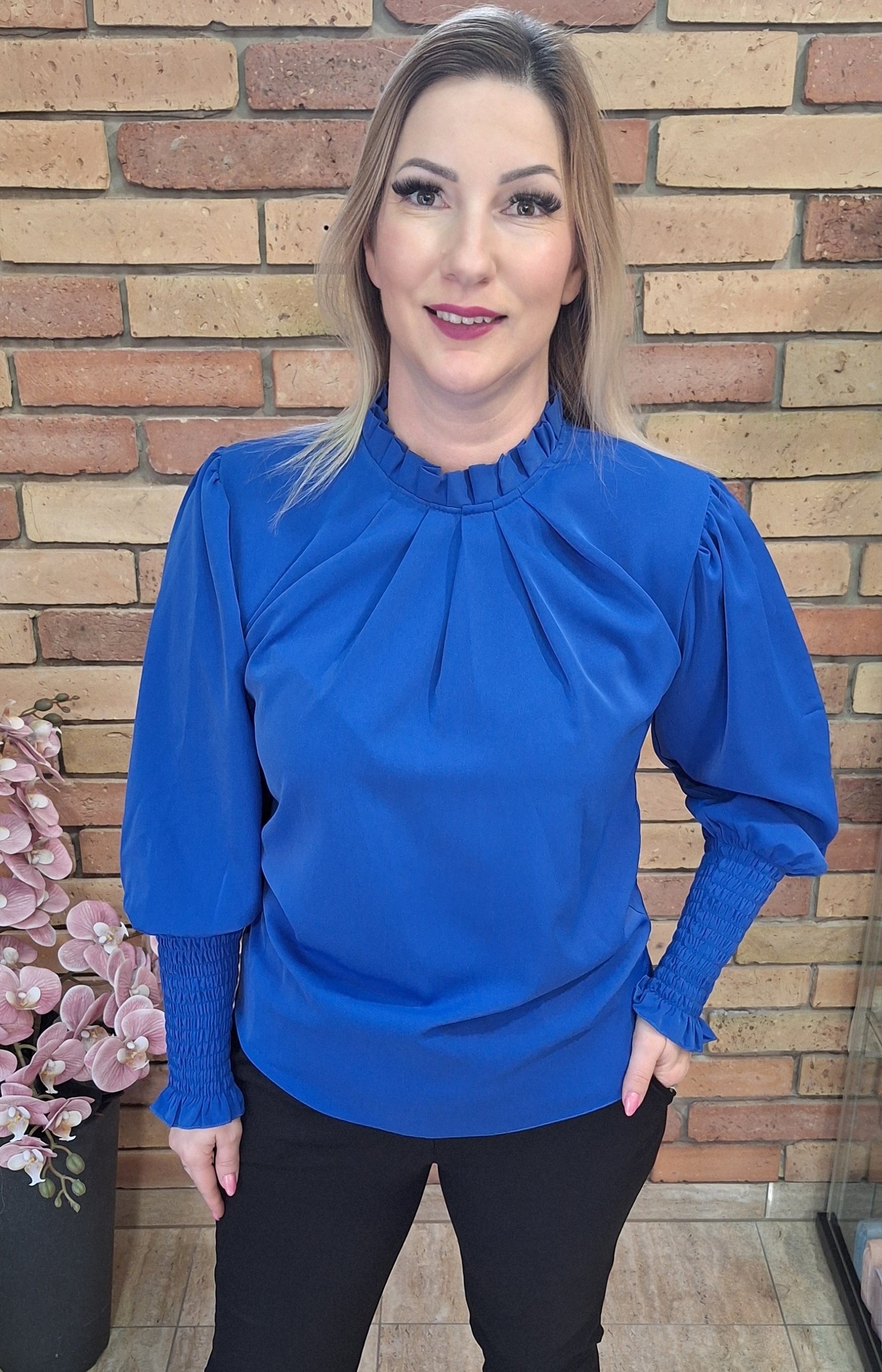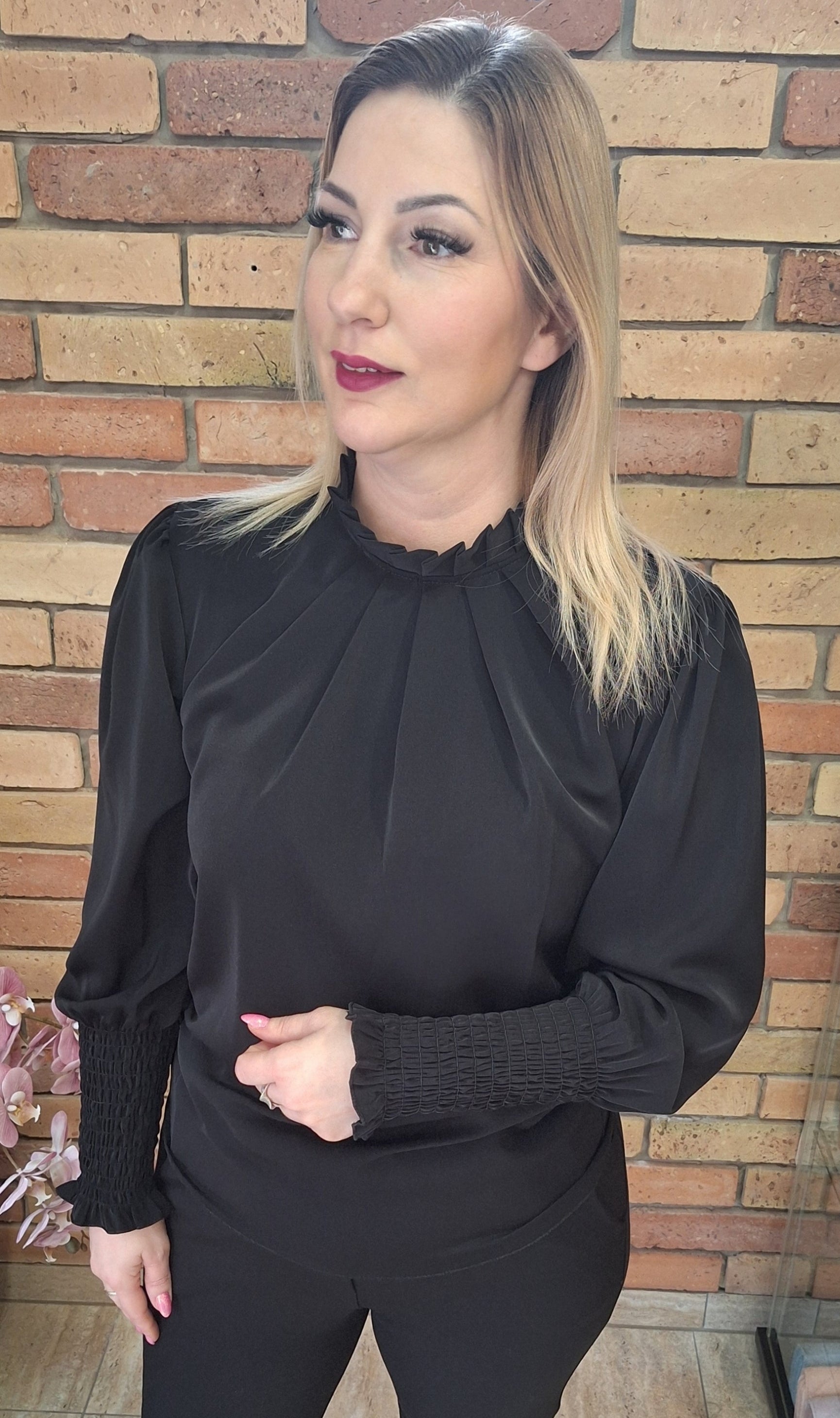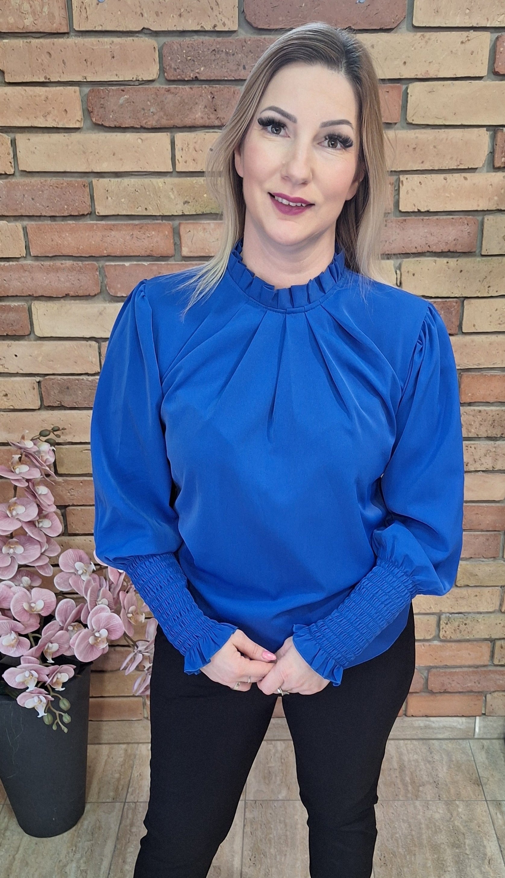 Csodaszép blúz, magasított fodros nyakkal! Mellnél húzott, ujja gumis passzés! Egyméretes S-l méretre ajánljuk!