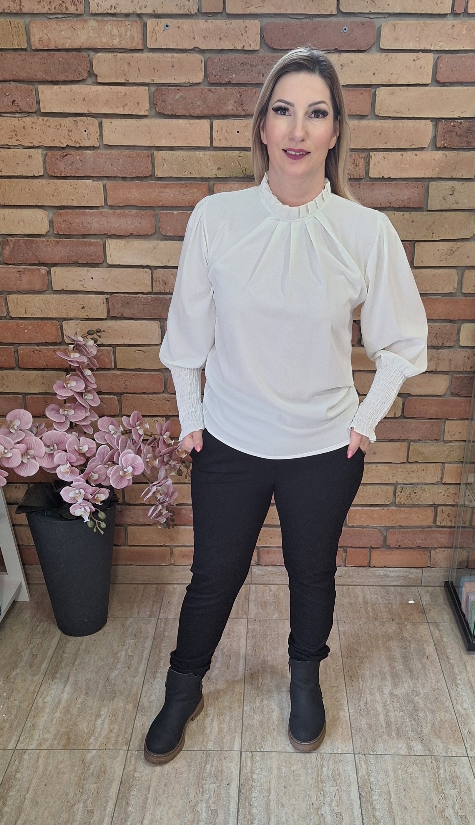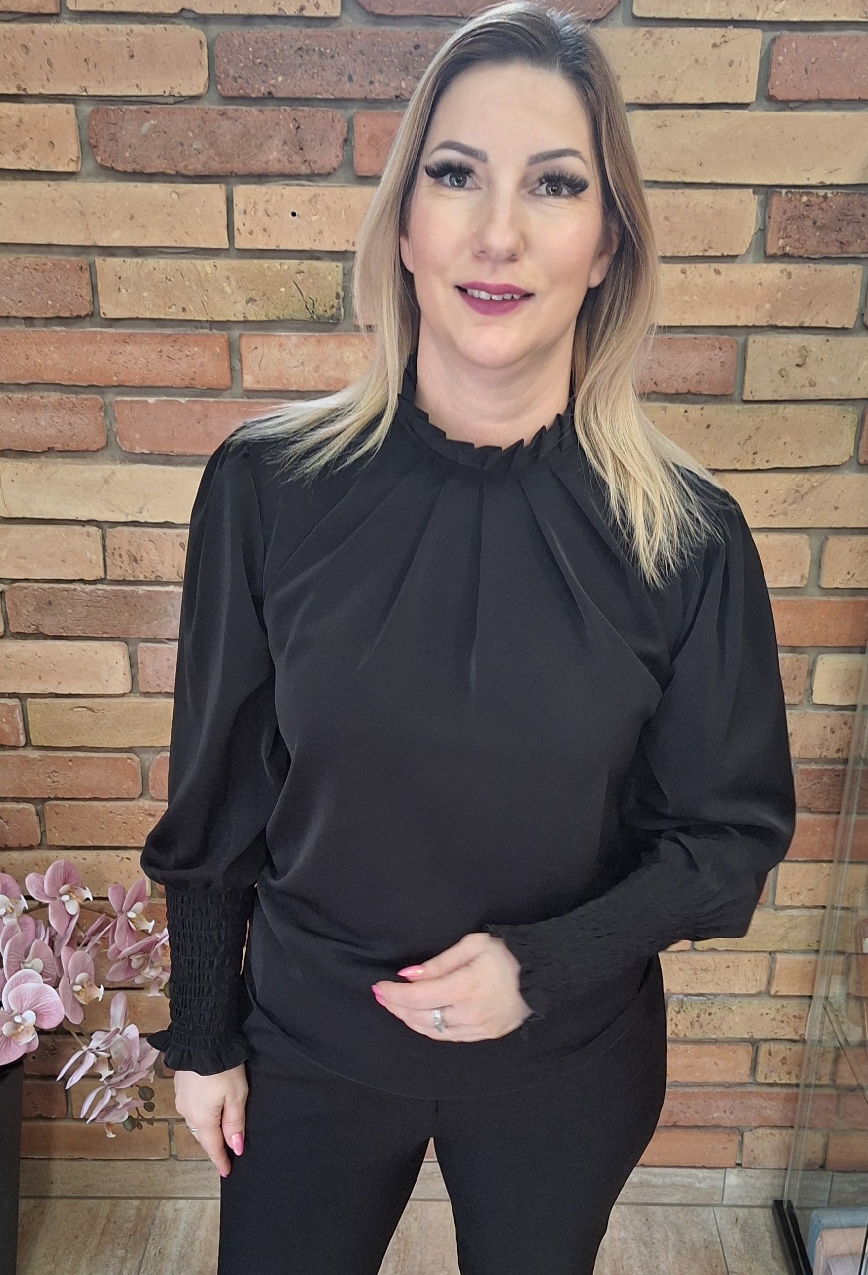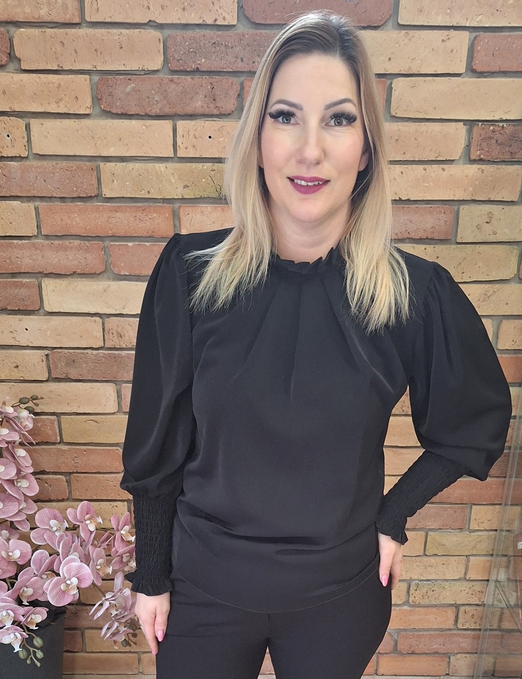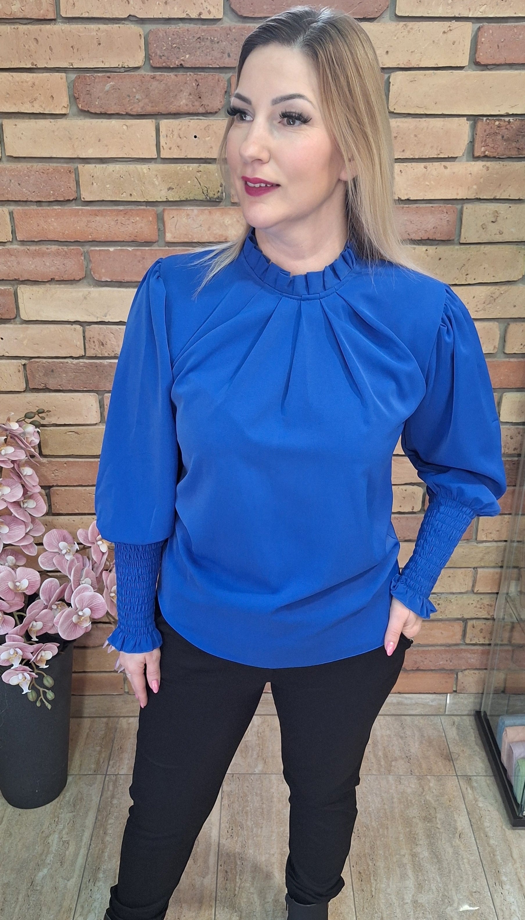 Csodaszép blúz, magasított fodros nyakkal! Mellnél húzott, ujja gumis passzés! Egyméretes S-l méretre ajánljuk!