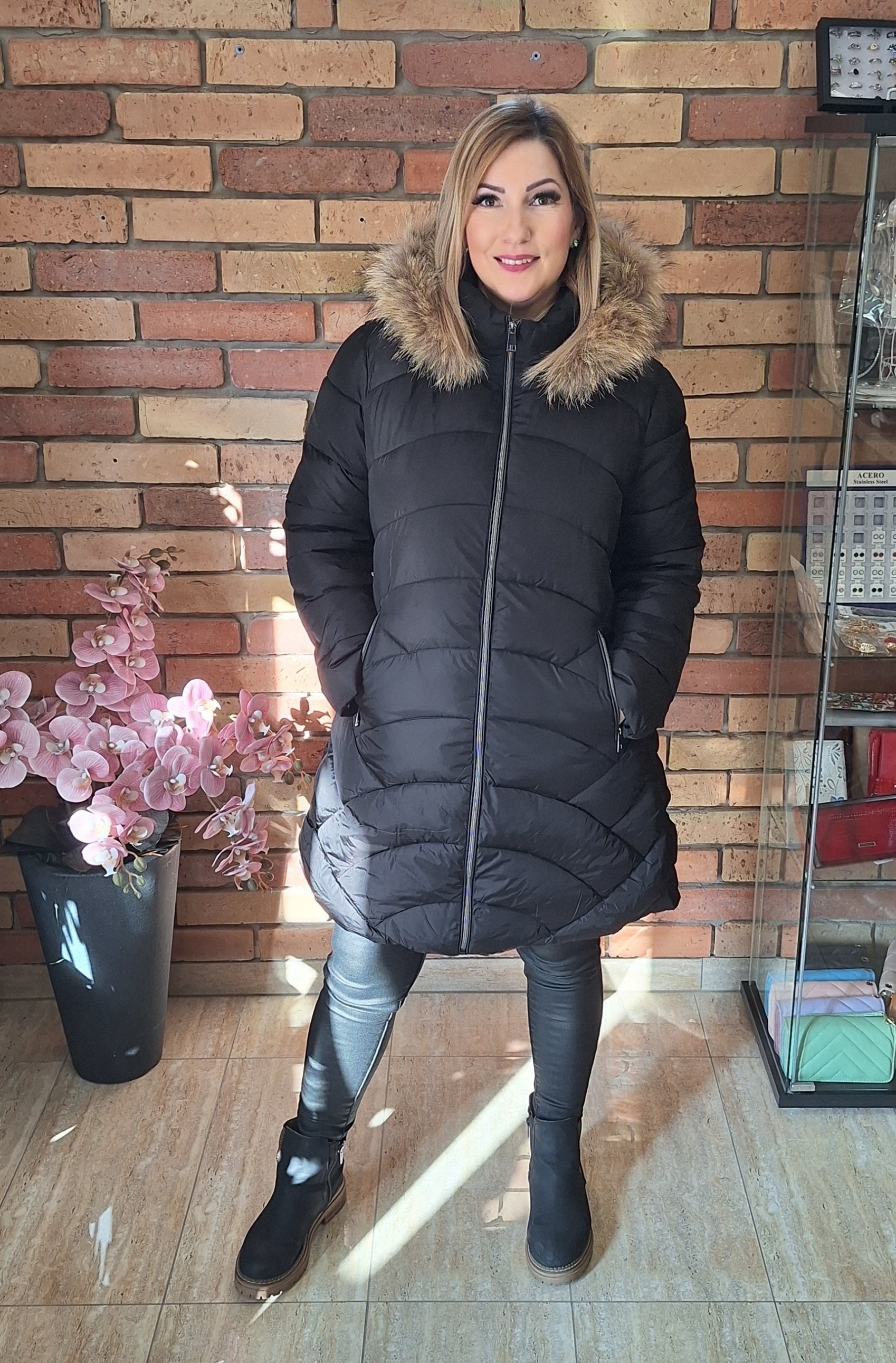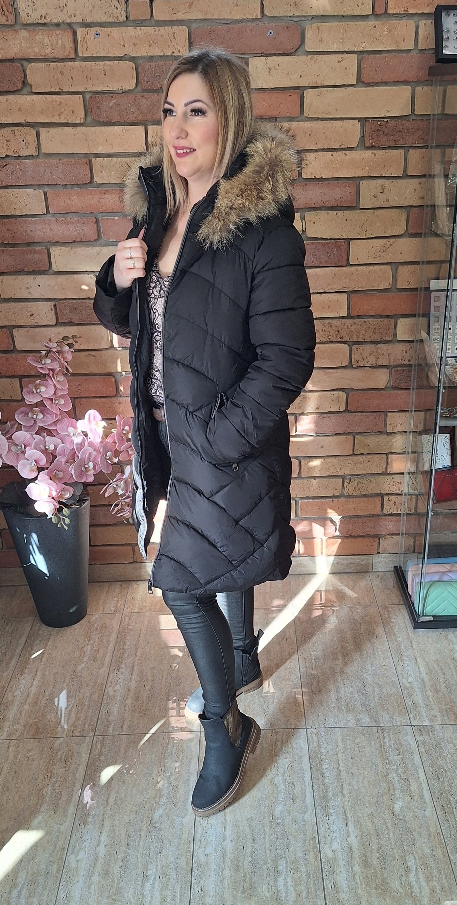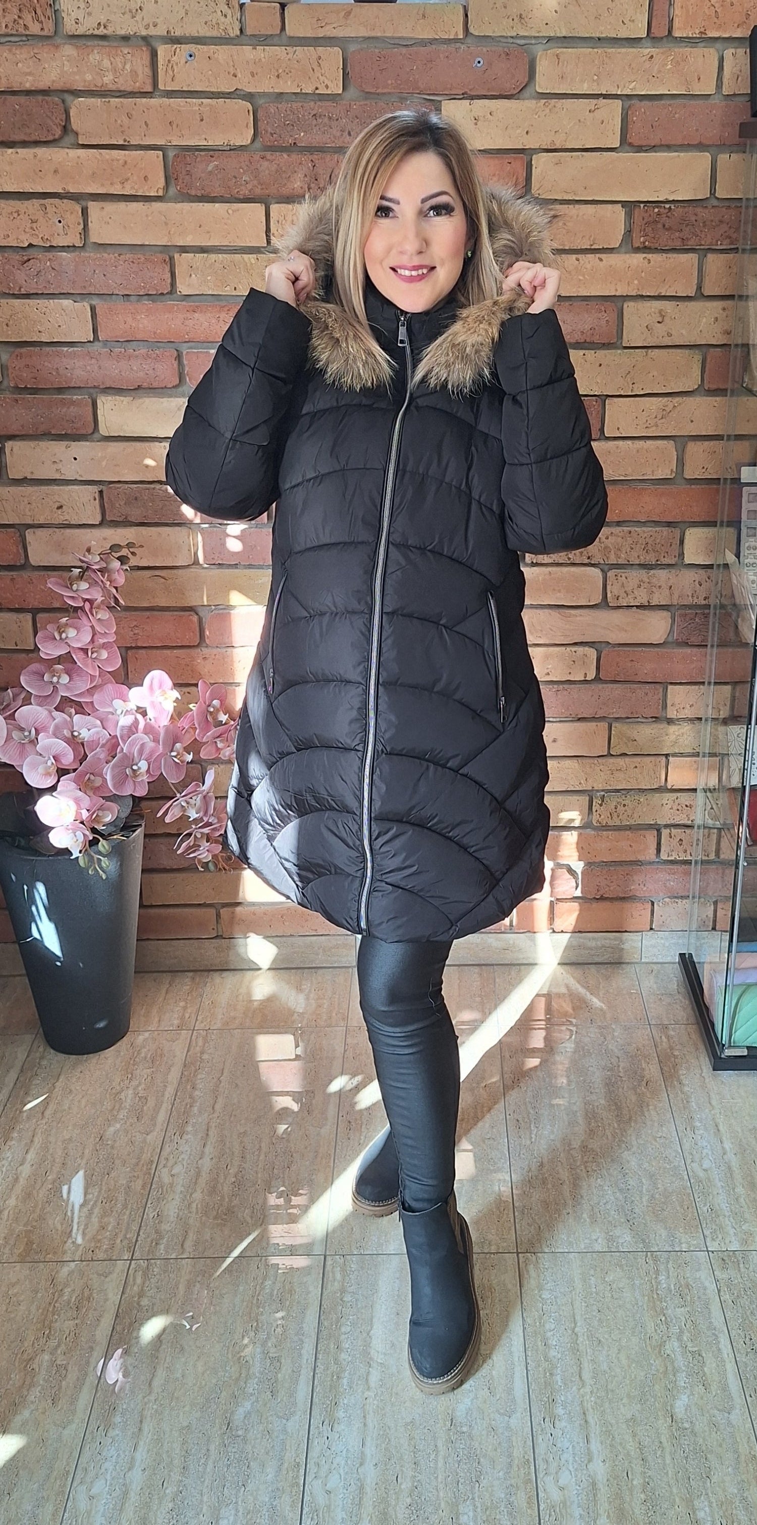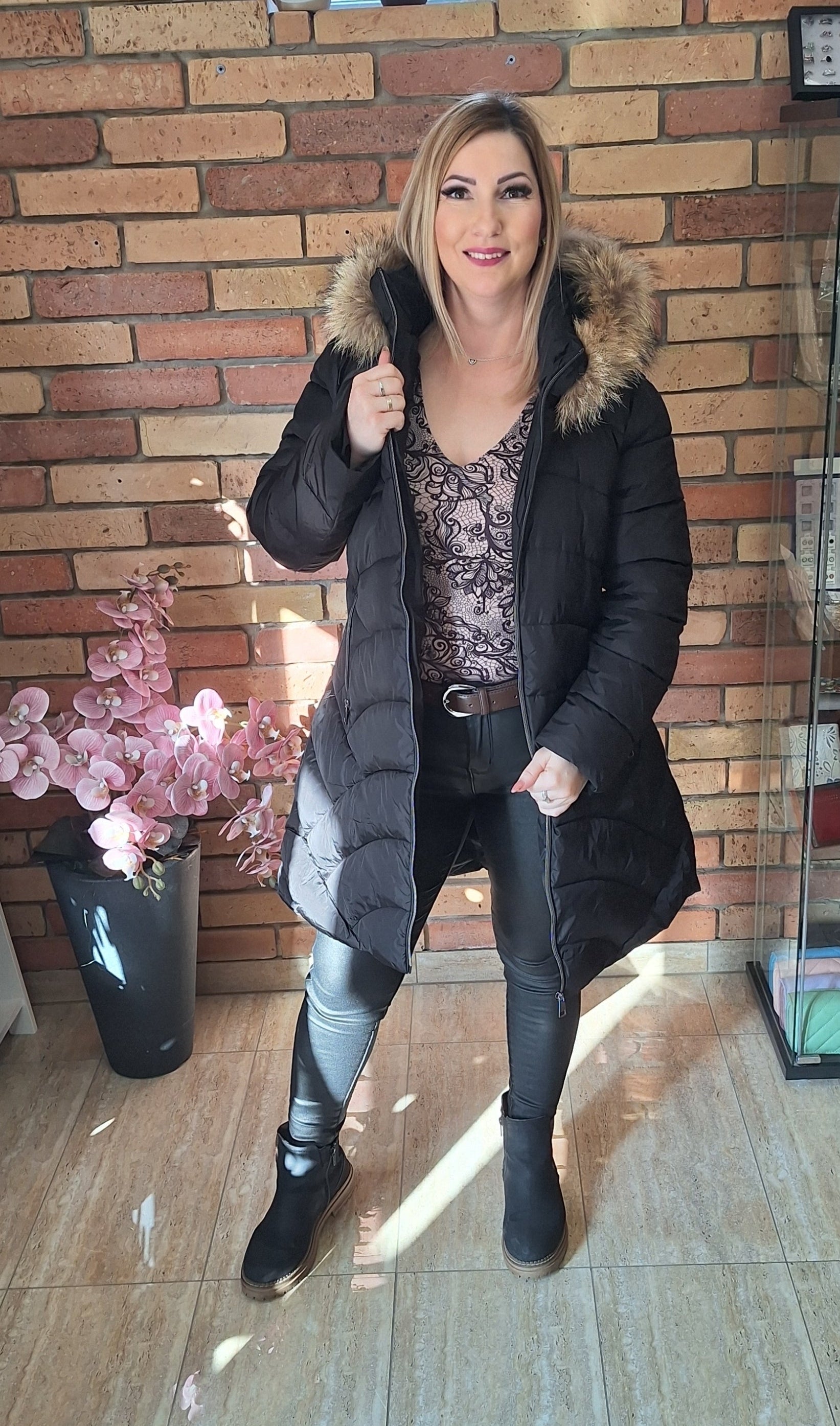 Fekete A vonalú téli kabát! Kapucni lezipzárolható! Zsebes!