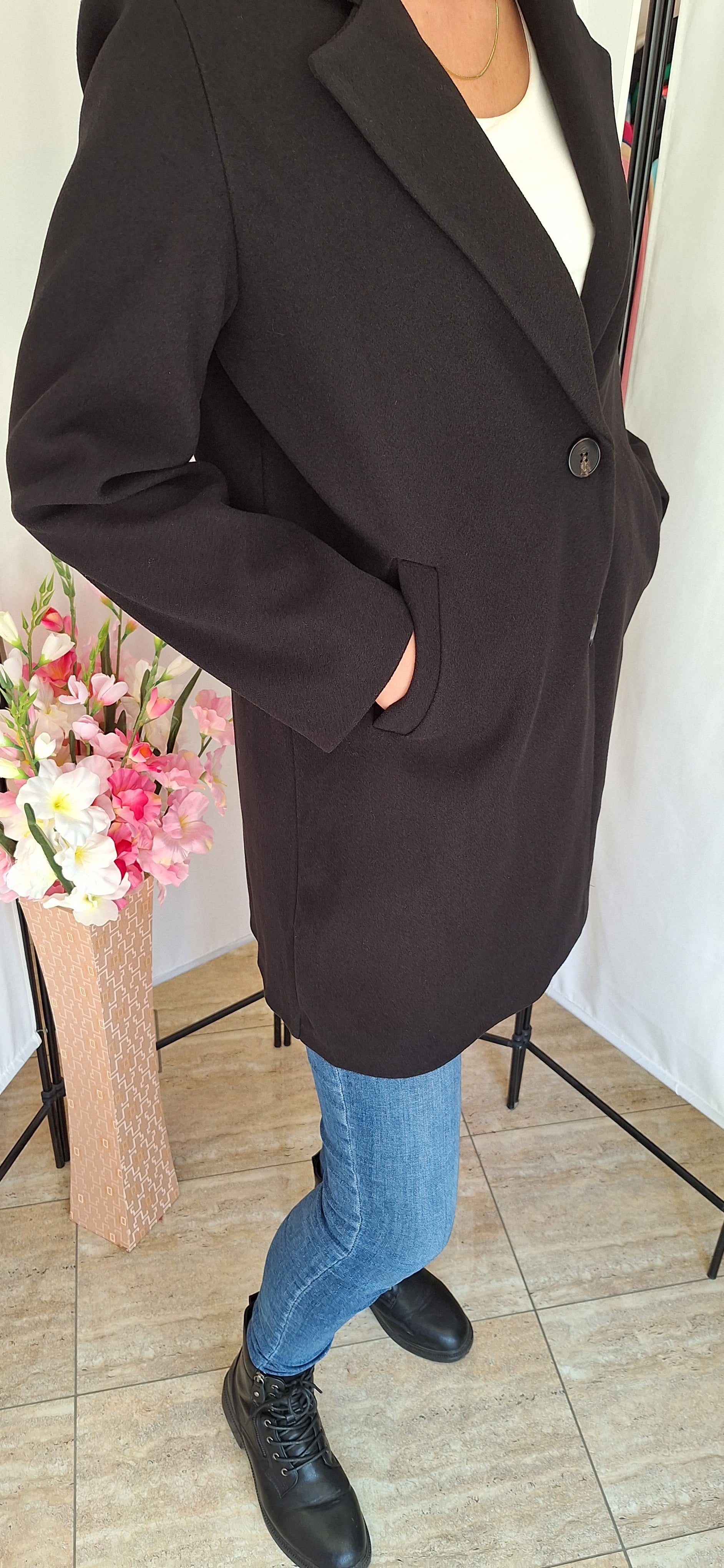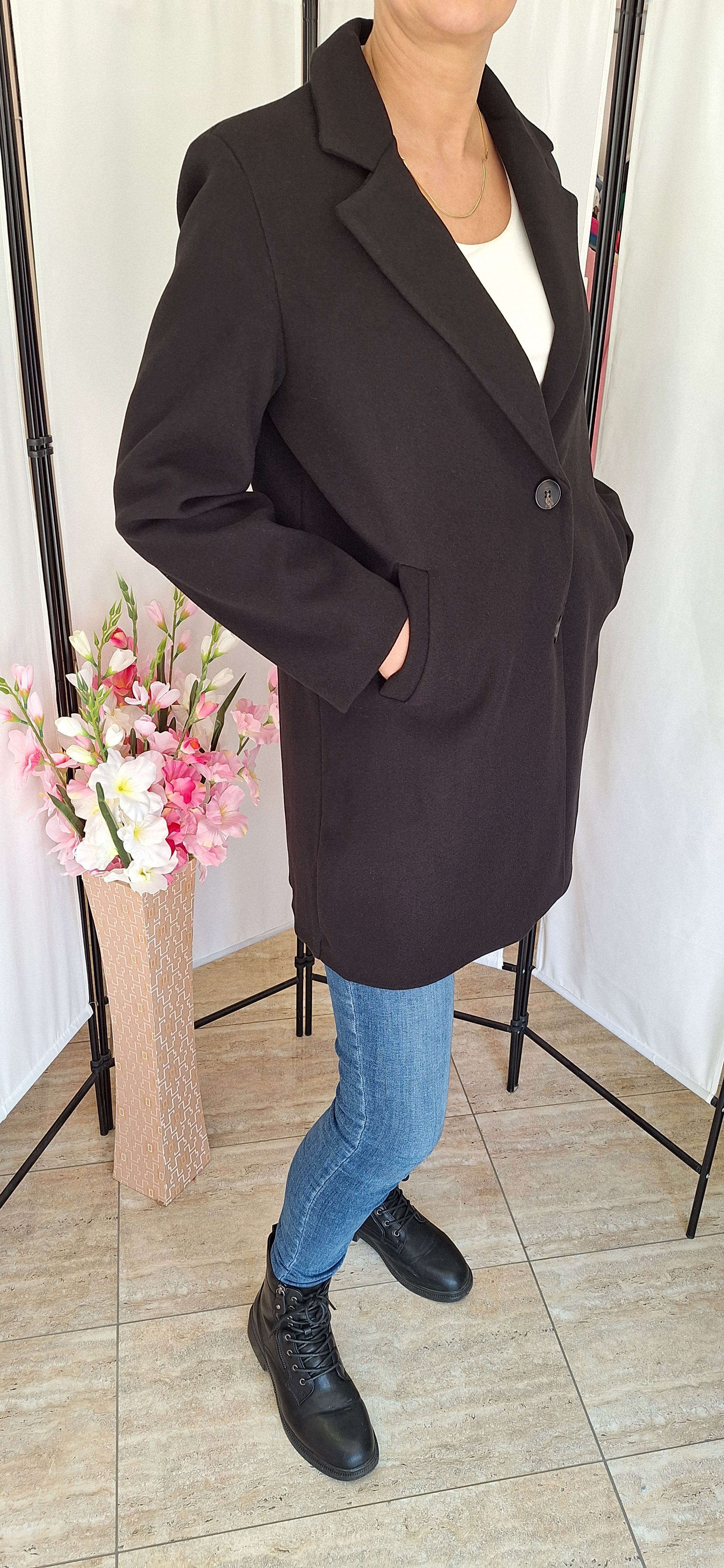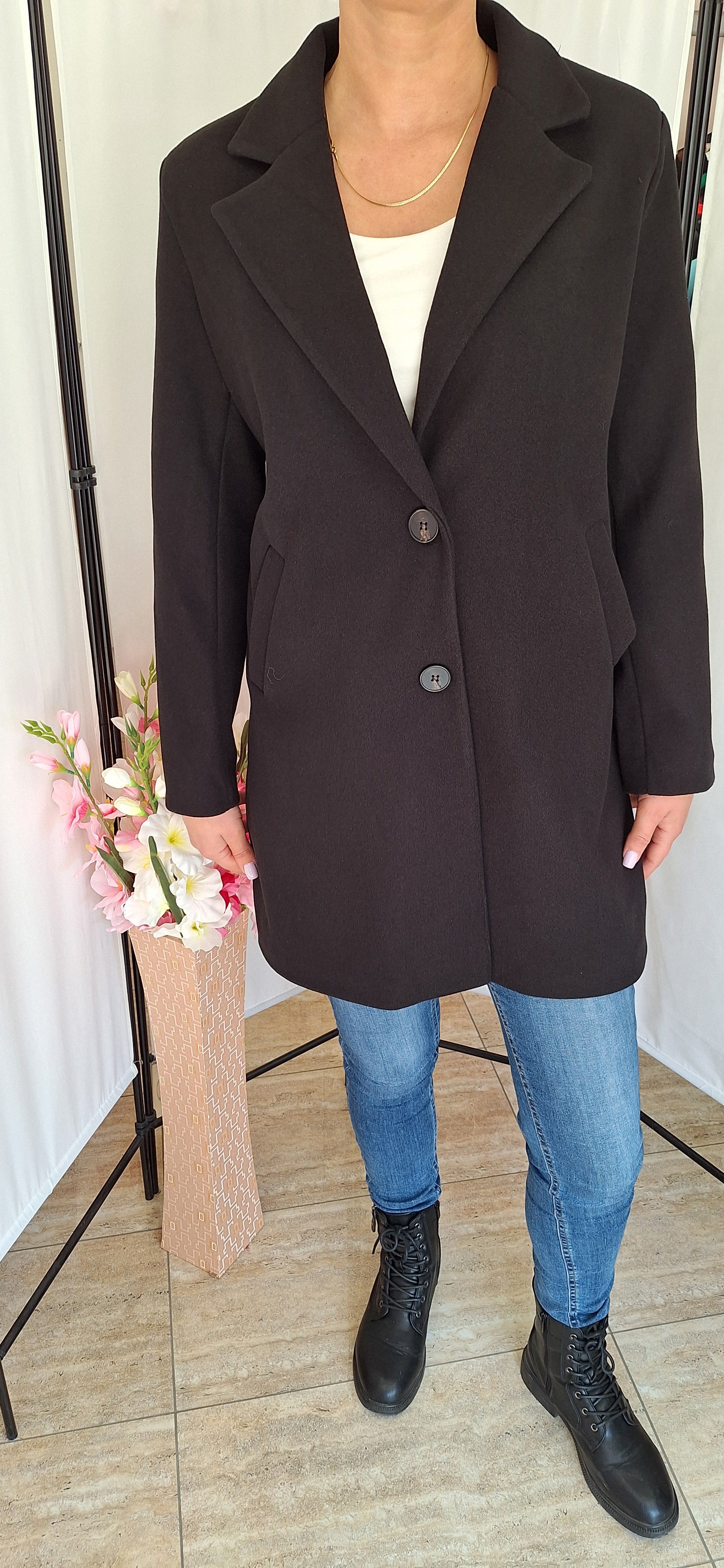 Nagy méretű szövetkabát. Elegáns, fekete.