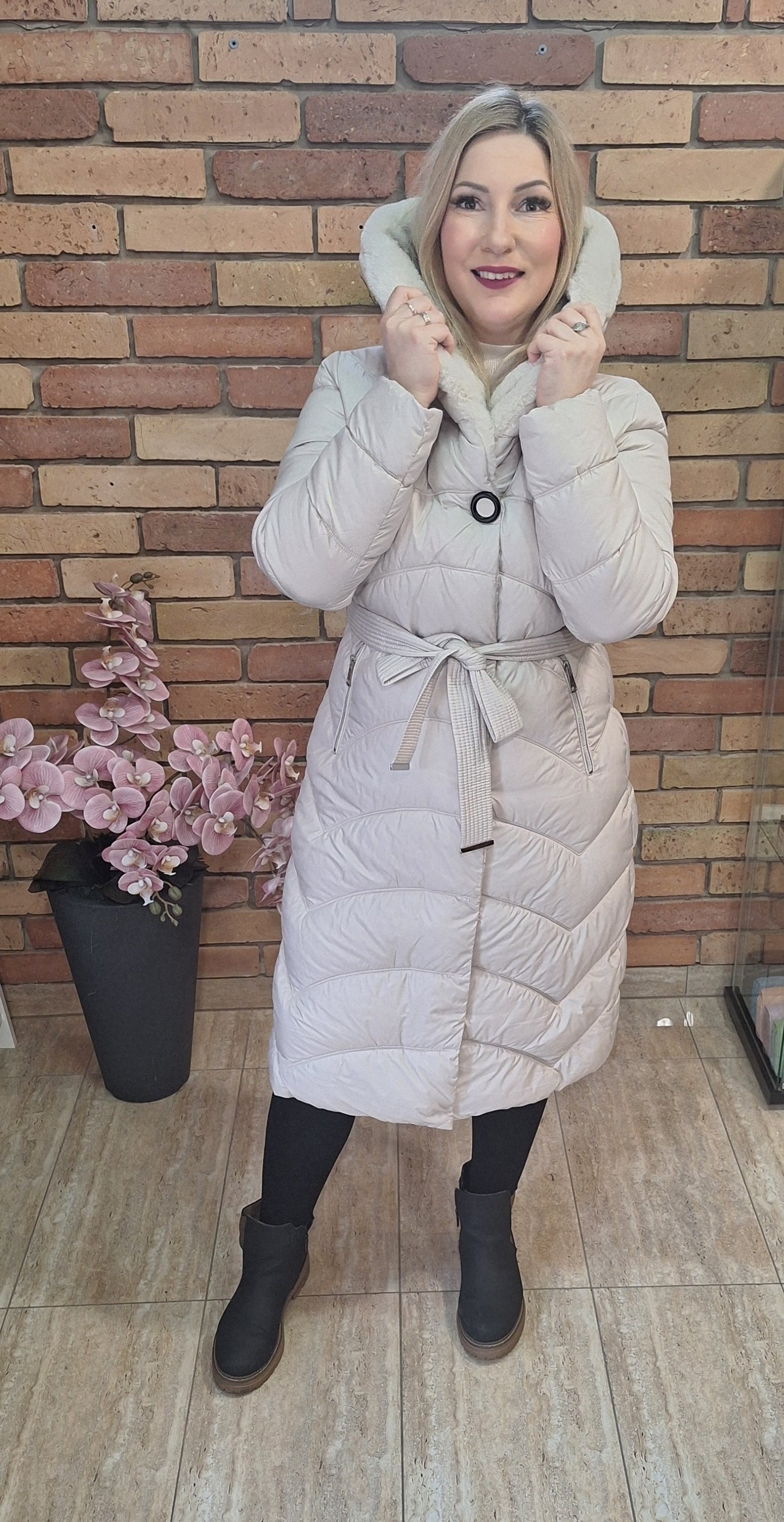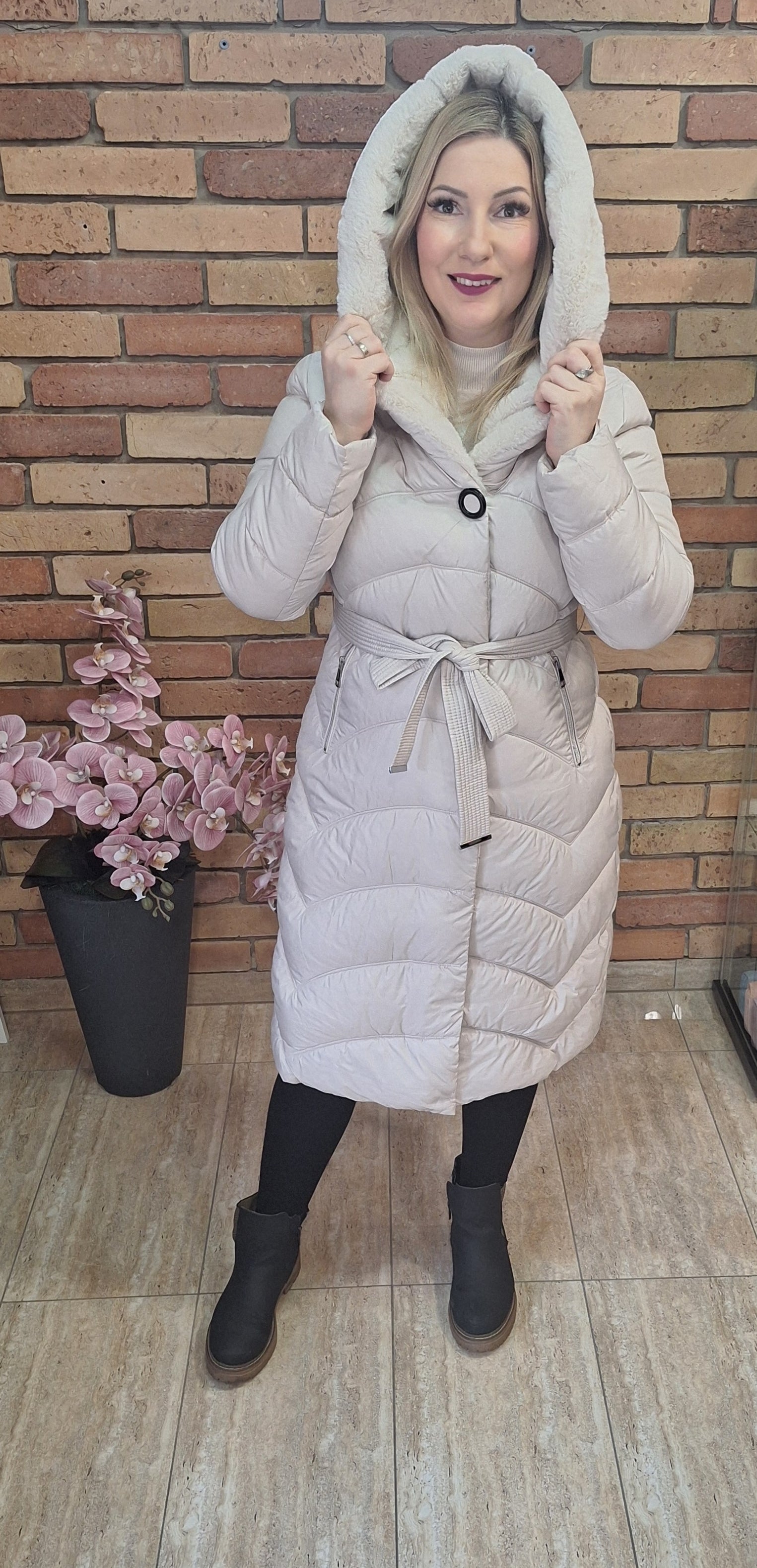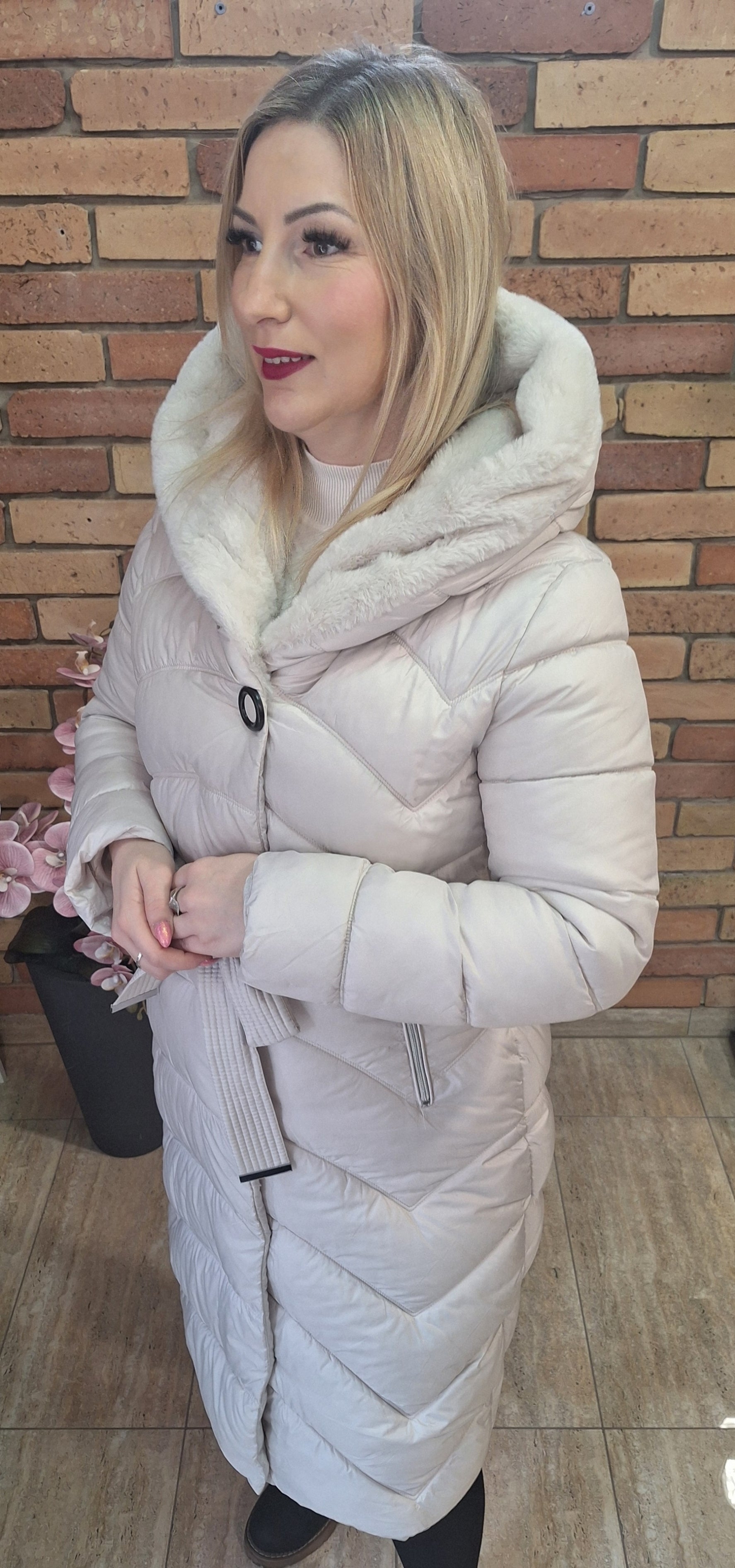 Nagyon szép téli kabát! Szürkés fehér színben! Zipzáros, patentos öves! A kapucni és a szörme egyben van a kabáttal, nem levehető! Meleg és csinos!