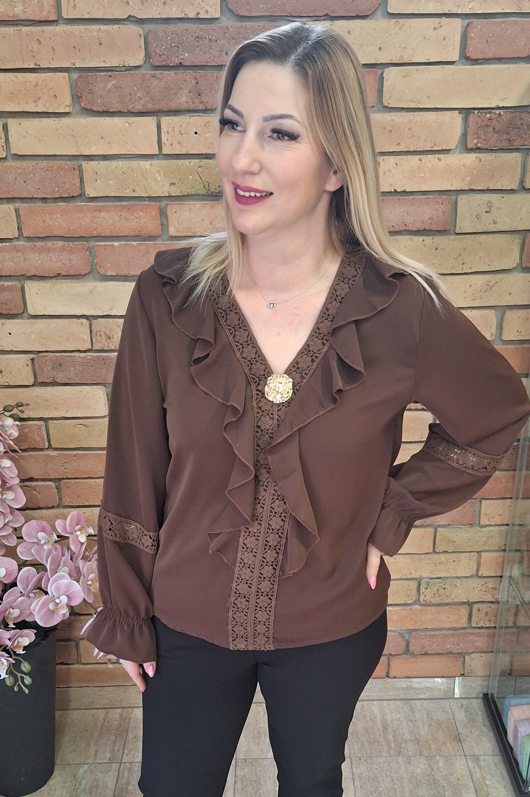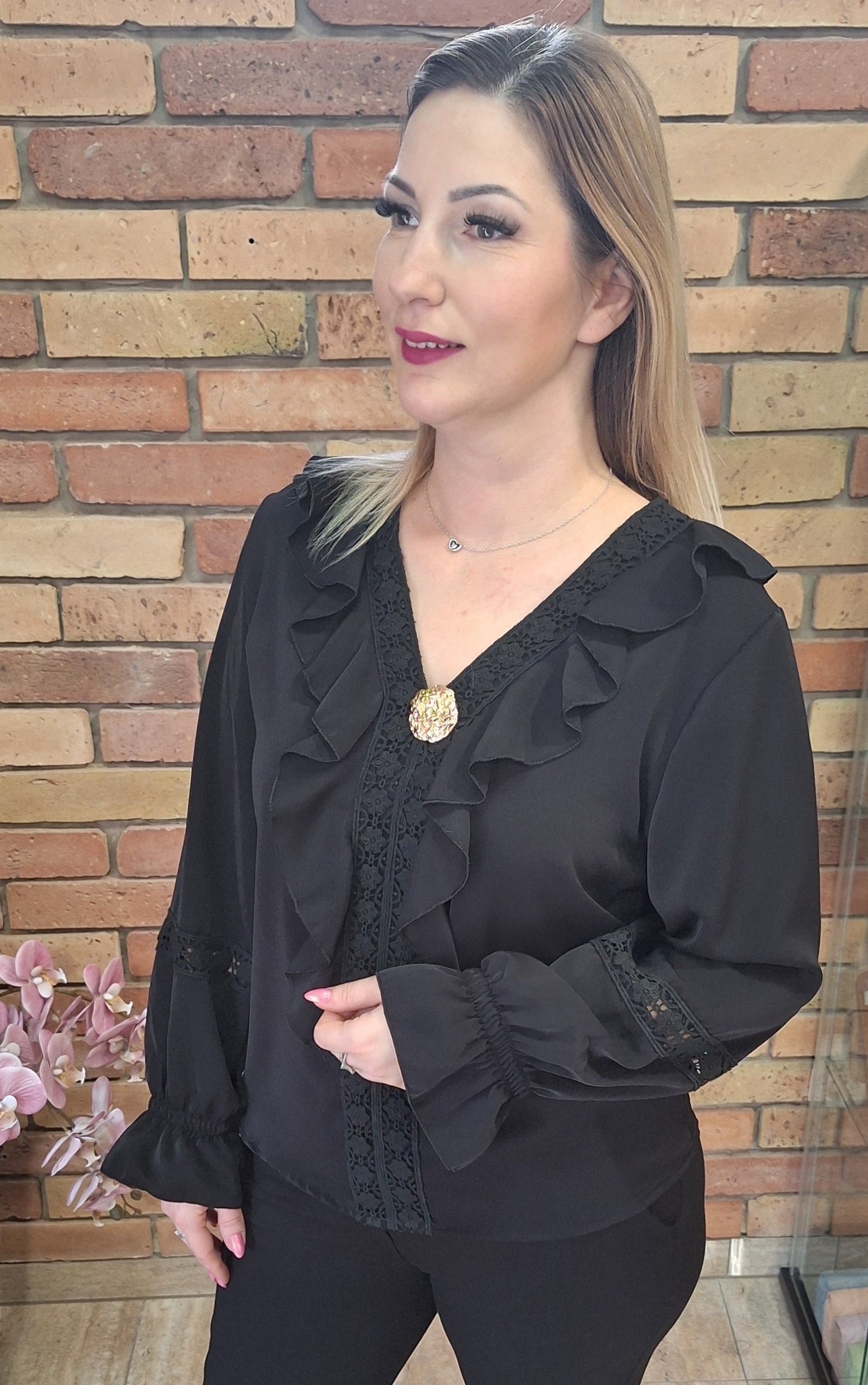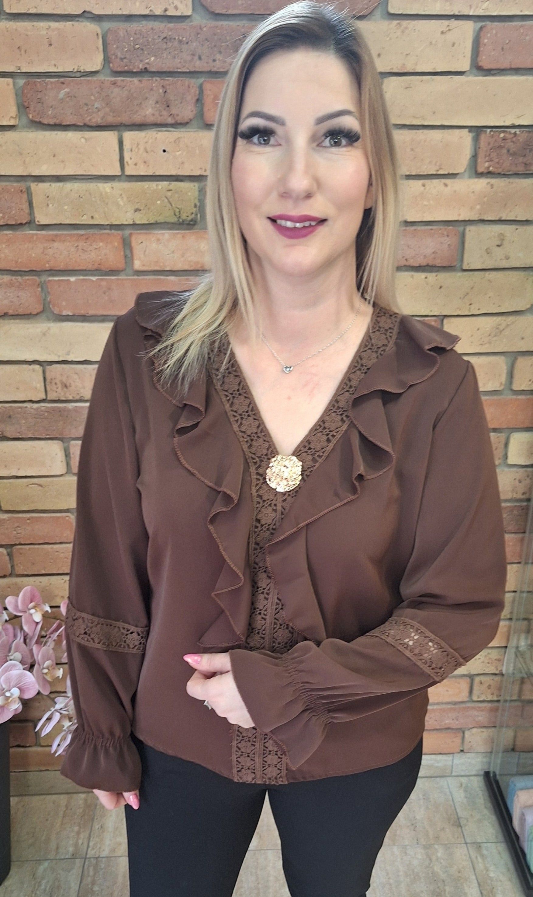 Csodaszép V-kivágású fodros blúz ajándék brossal! 😊